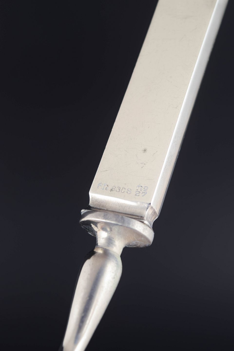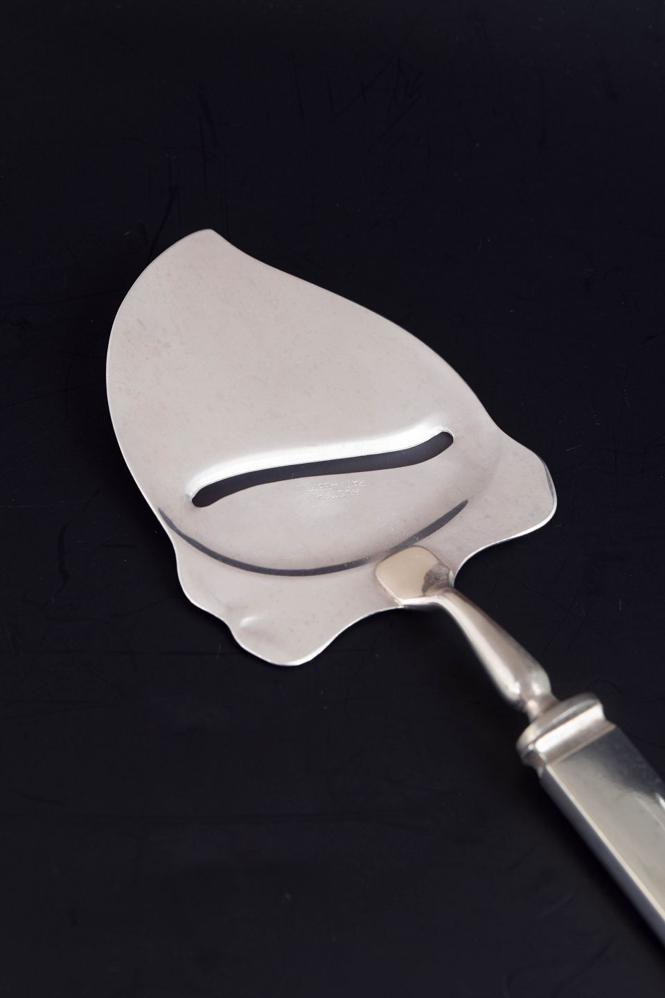 Art deco ostehøvl i tretårnet sølv og rustfrit stål. Model nummer 27 med dekorativt skaft i relief med stiliseret blomstermotiv. Fremstillet hos Evald Nielsen.