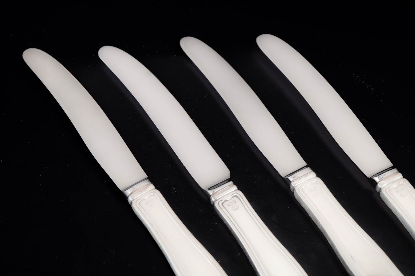 Sæt af fire frugtknive i rustfrit stål og sterlingsølv med skaft i mønstret Dobbeltriflet. Knivene har slanke blade i rustfrit stål og elegante sølvskaft med de karakteristiske parallelle rifler langs kanten, et klassisk design fra Georg Jensen.