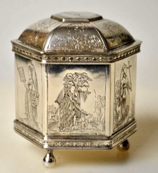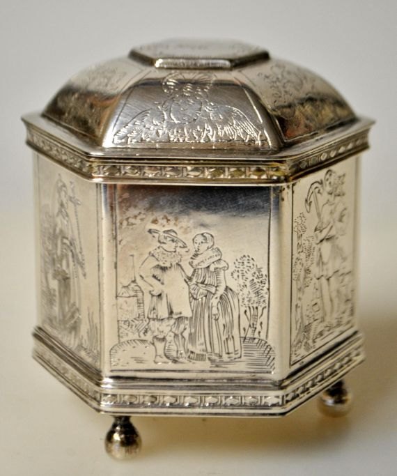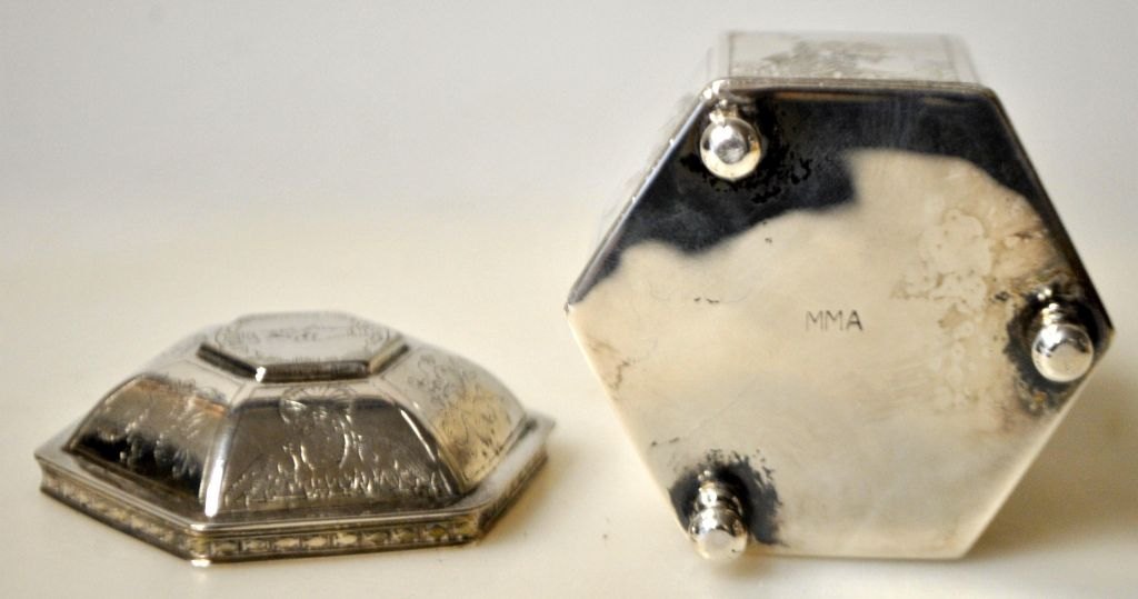 Bryllups æske, kopi af original fra 17. årh. Holland fra Metropolitan Museum of Art, New York, 20. årh. Sekskantet med 1600-tals motiver på alle sider. Låg dekoreret med engle, blomster og håndfæstning. På tre fødder. Messing med sølv. Indvendig lueforgyldt. Stemplet: MMA. H: 7 cm.