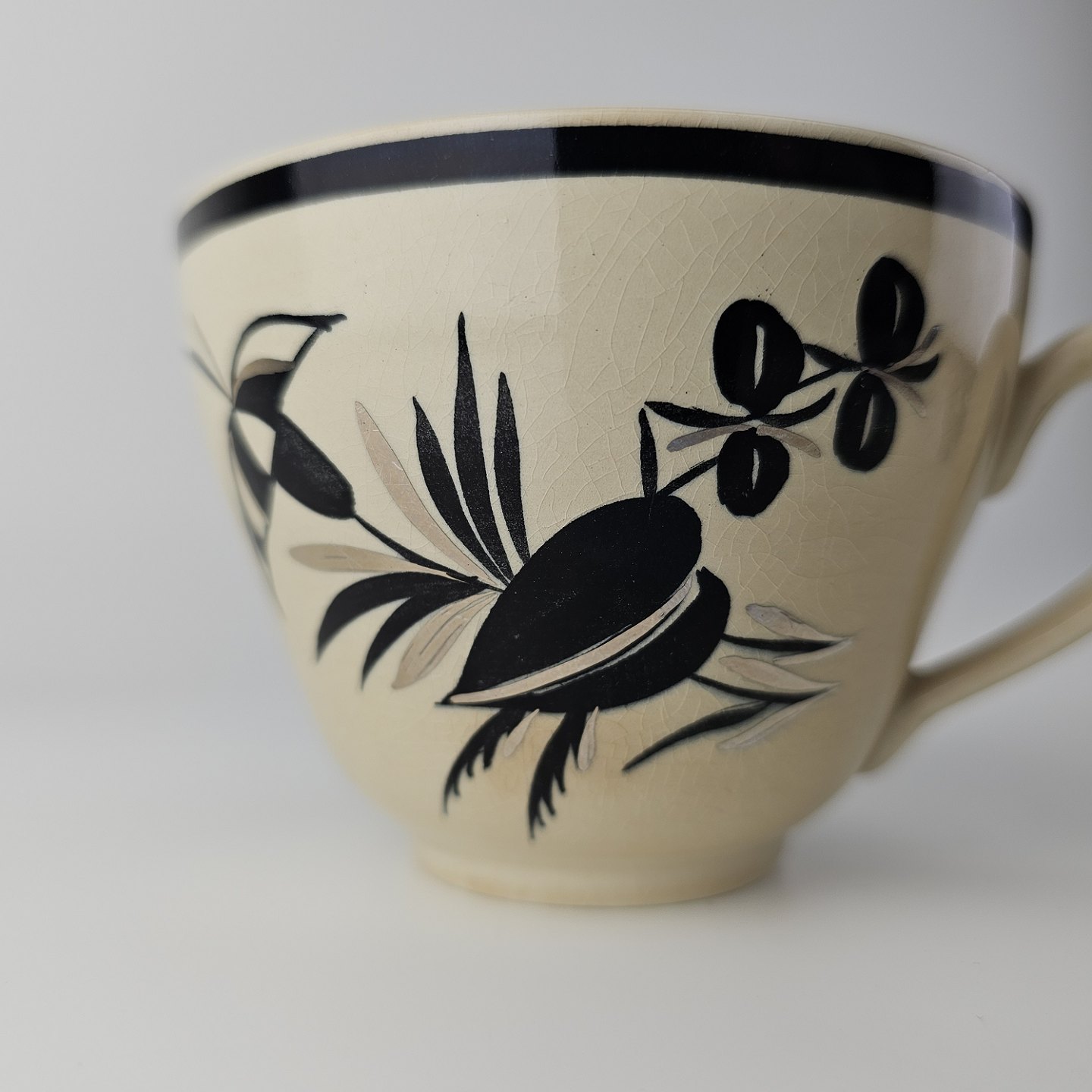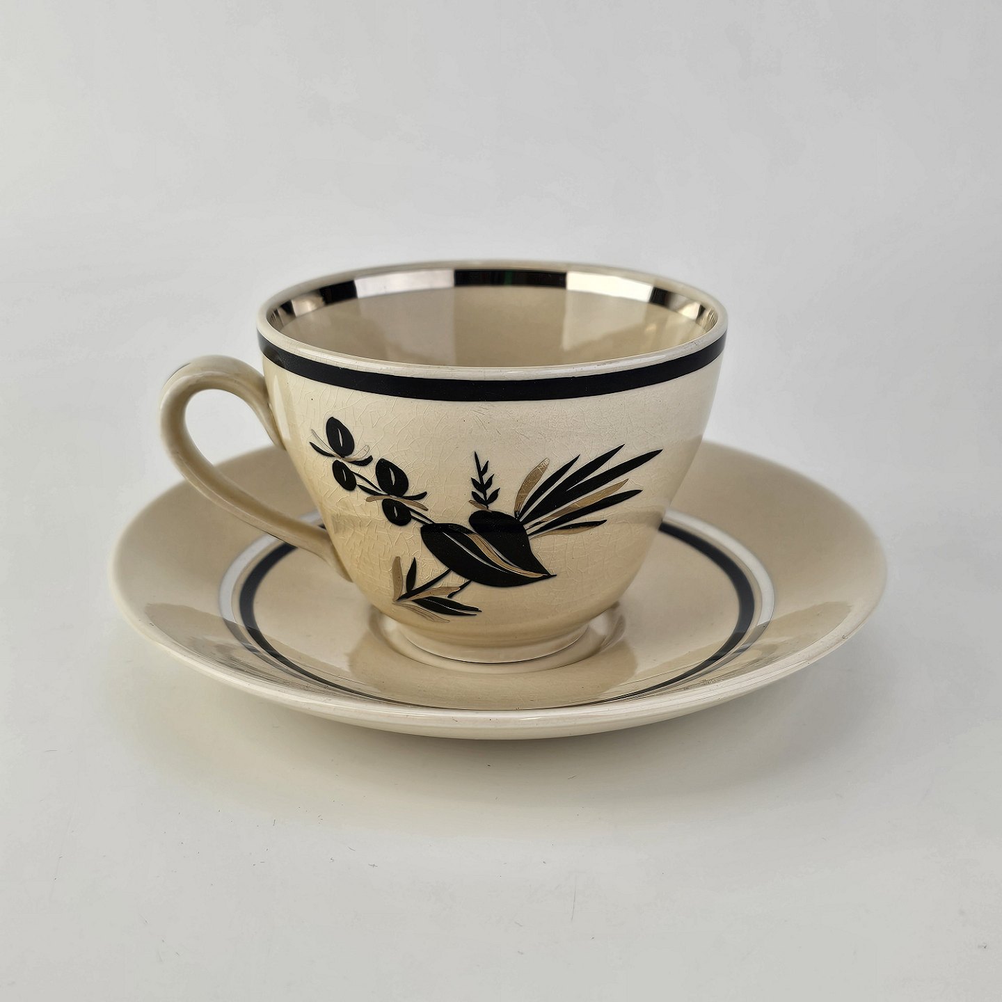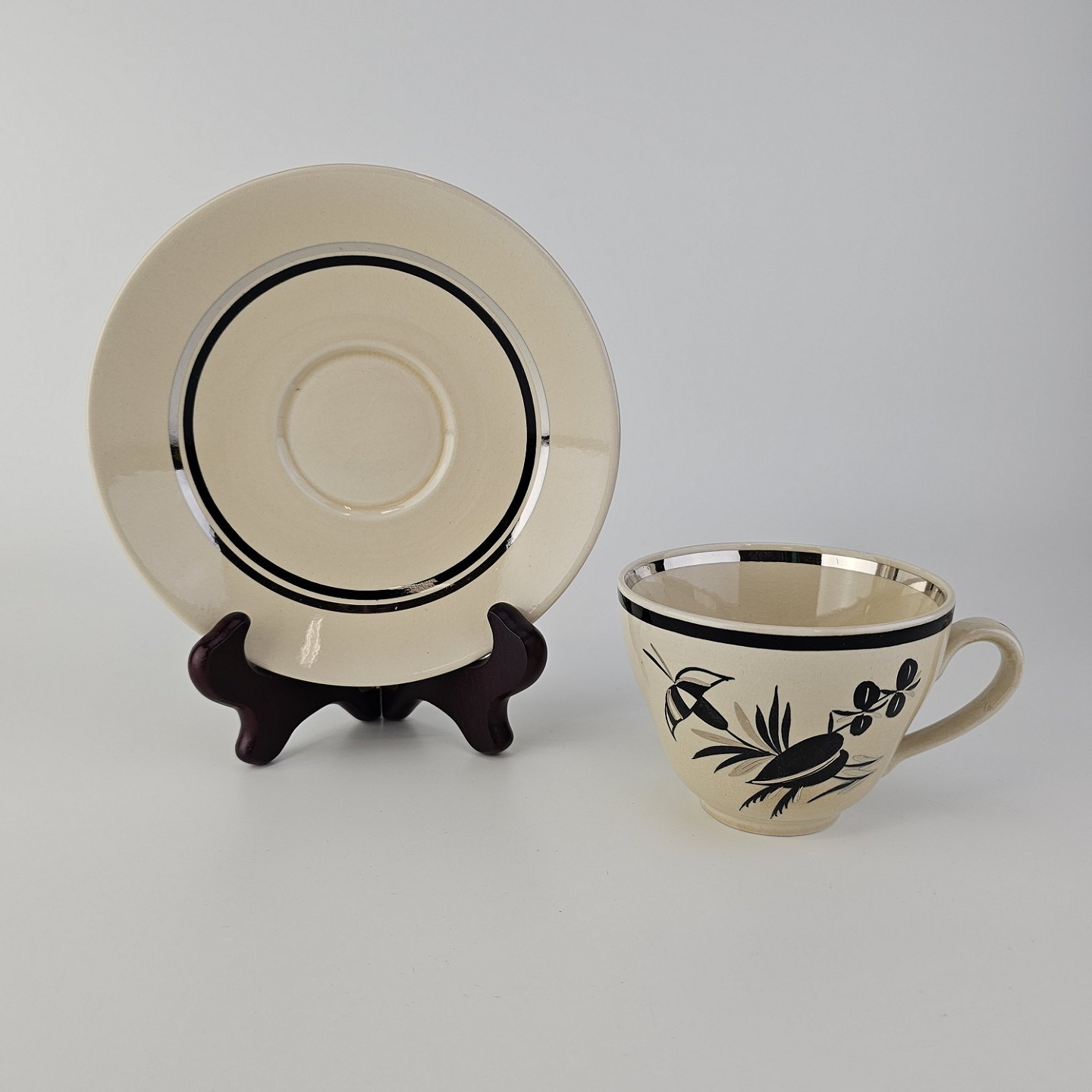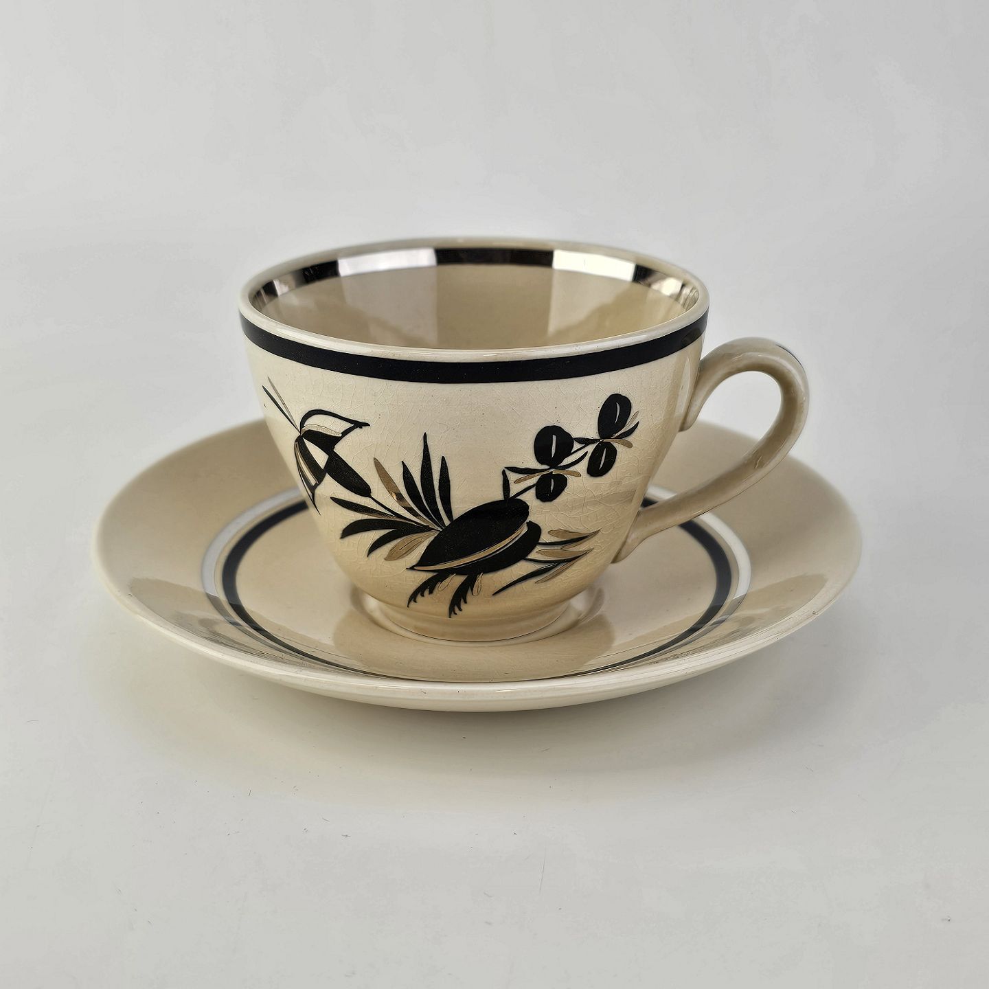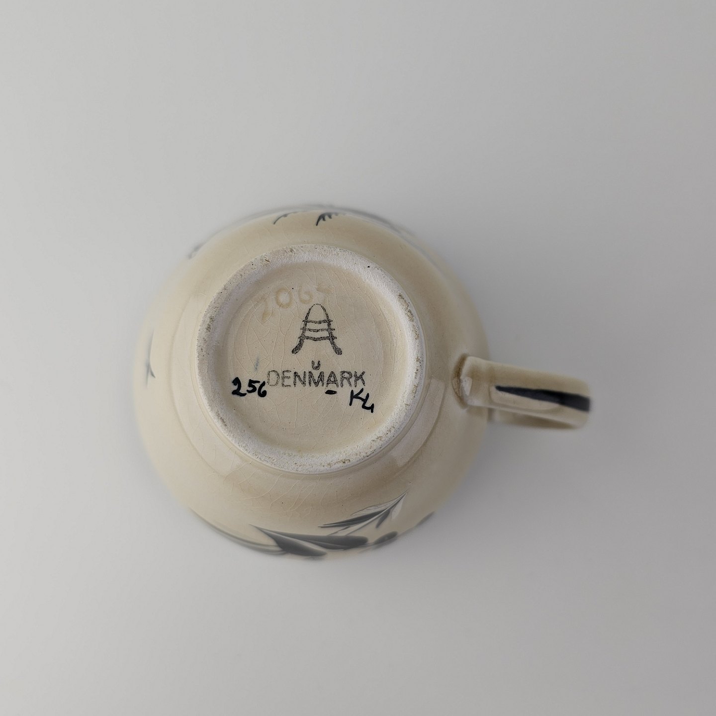 Kaffekop med underkop i fajance fra stellet Dragsholm fremstillet i perioden 1934-1965.