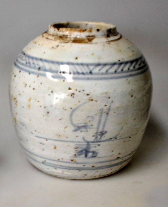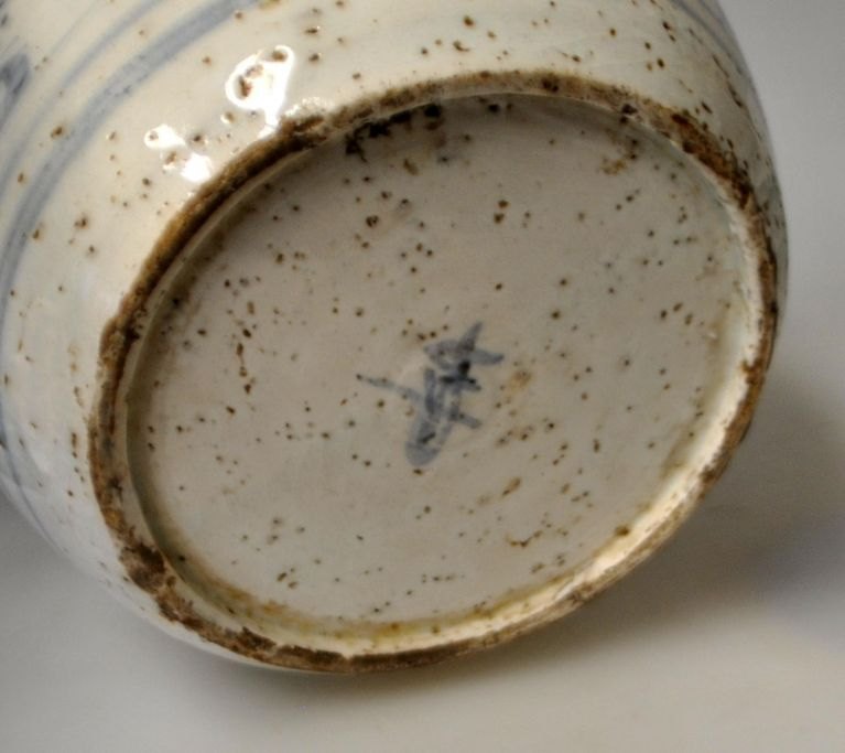 Kinesisk bojan uden låg, 19. årh. Med håndmalet blå dekoration af kystlandskab. Signeret. H.: 16 cm.