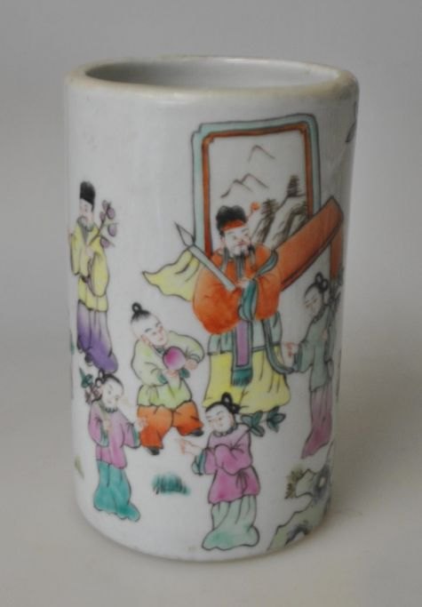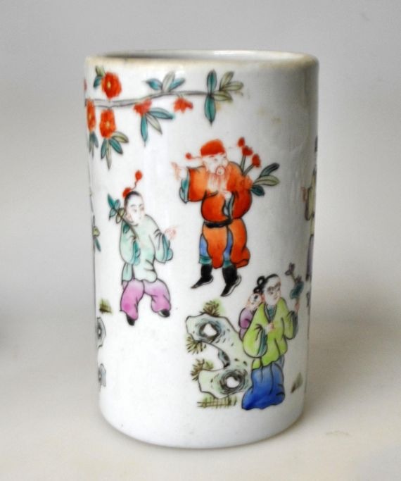 Kinesisk porcelæns penselbæger, 19./20. årh. Med håndmalet dekoration med en masse mennesker. Stemplet. H.: 13 cm.