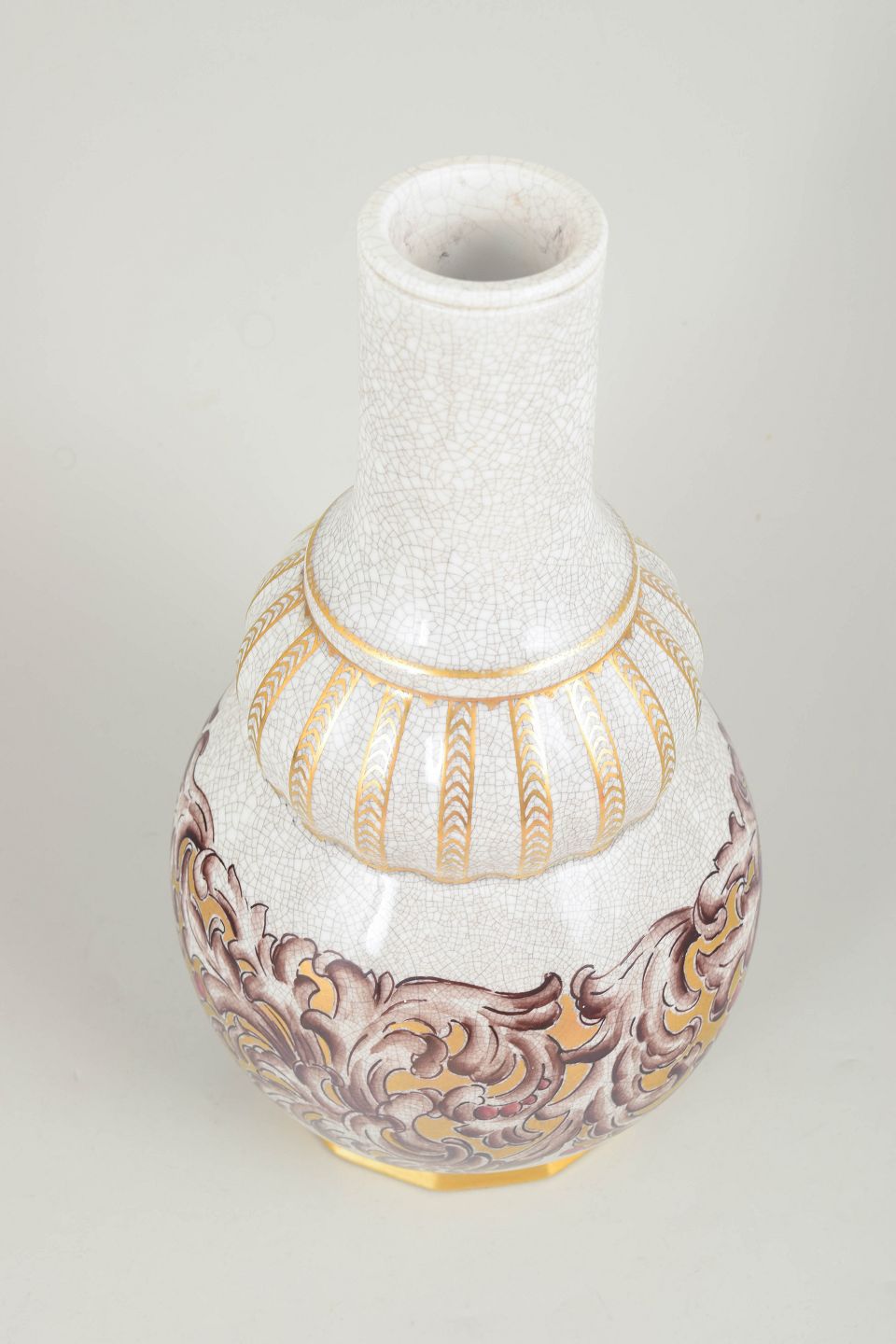 Elegant porcelænsvase med høj slank hals og balusterformet korpus dekoreret med reliefagtige ornamenter i guld og polykrome toner mod en krakeleret glasur. Formen og dekorationen afspejler den dekorative stil fra art deco-perioden. Modelnummer 133/320, stemplet Dahl-Jensen København i bunden.