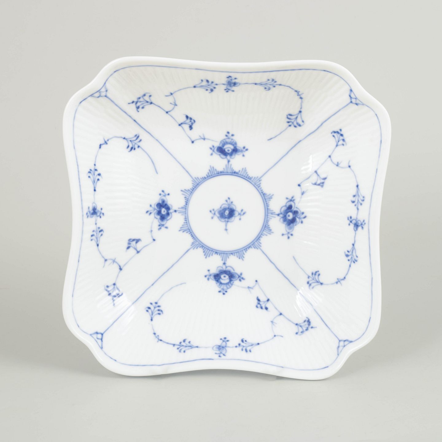 Håndmalet firkantet skål i porcelæn dekoreret med det klassiske musselmalede riflet mønster i blå underglasur. Skålen har svagt buede sider med riflede detaljer og et centralt blomsterornament omgivet af slyngede blomstergrene. Undersiden er fabriksstemplet Royal Copenhagen og annulleret med én indridset streg gennem fabriksstemplet. Model 1/26.