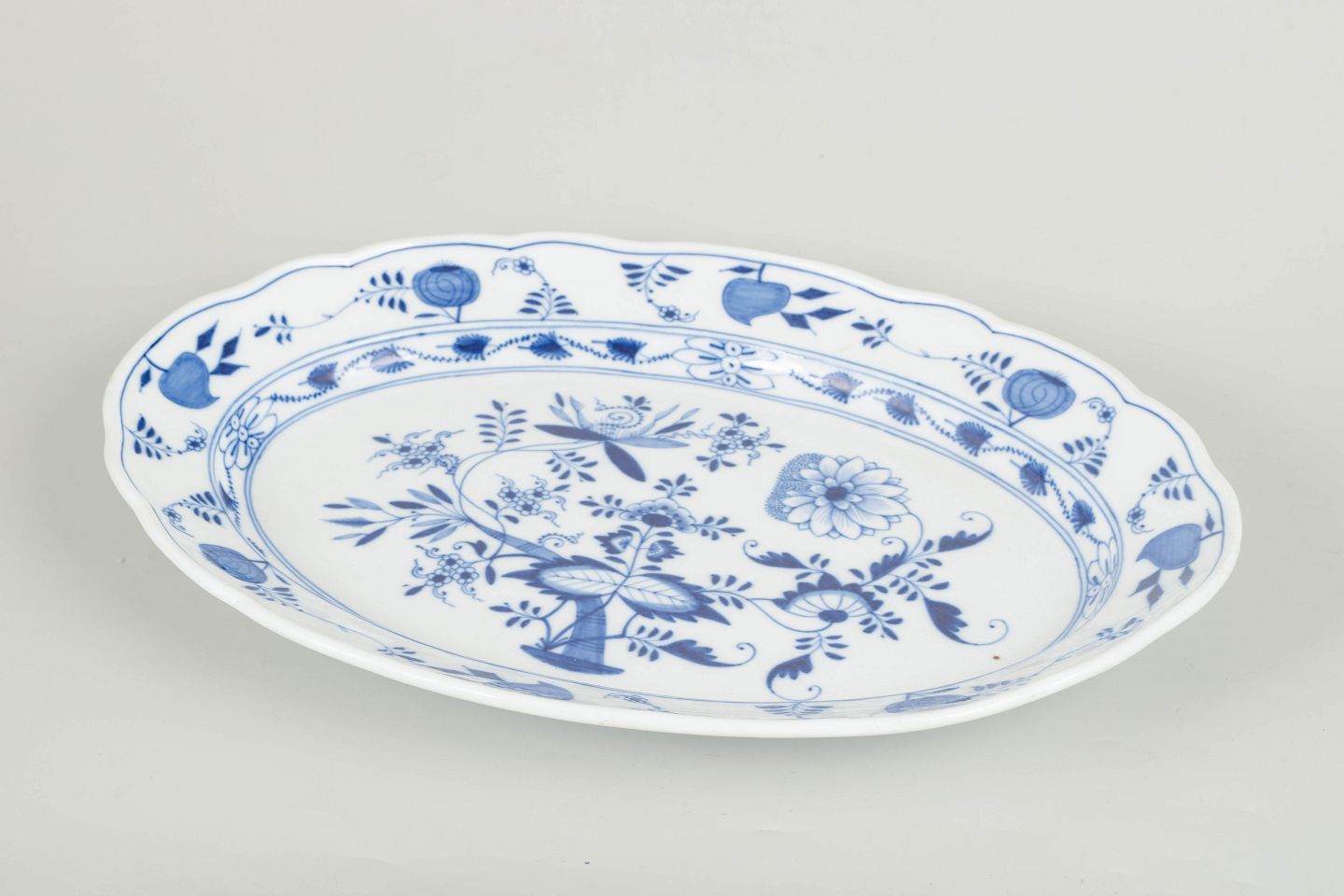 Stort ovalt serveringsfad i porcelæn dekoreret med det klassiske håndmalede løgmønster i koboltblå underglasur. Formen har en elegant svungen fane med kontureret rand og en central blomsteropsats omgivet af stiliserede blomster- og frugtmotiver. Modellen blev fremstillet hos Meissen i begyndelsen af 1900-tallet og er mærket på undersiden med de karakteristiske krydsede sværd, annulleret med to indridsede streger.
