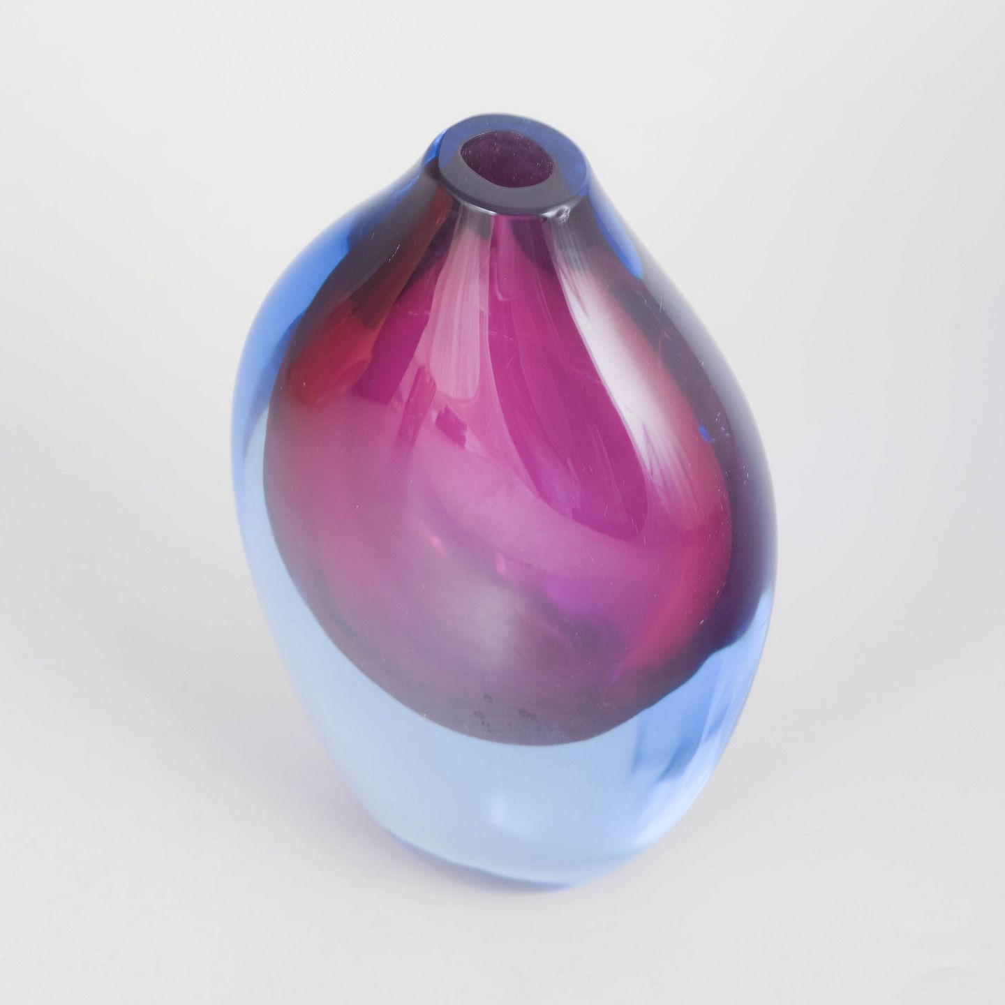Dekorativ kunstglasvase i klart blåt glas med indkapslet rosa kerne og blød organisk form, udført i karakteristisk Murano-stil med lagdelt glas.
