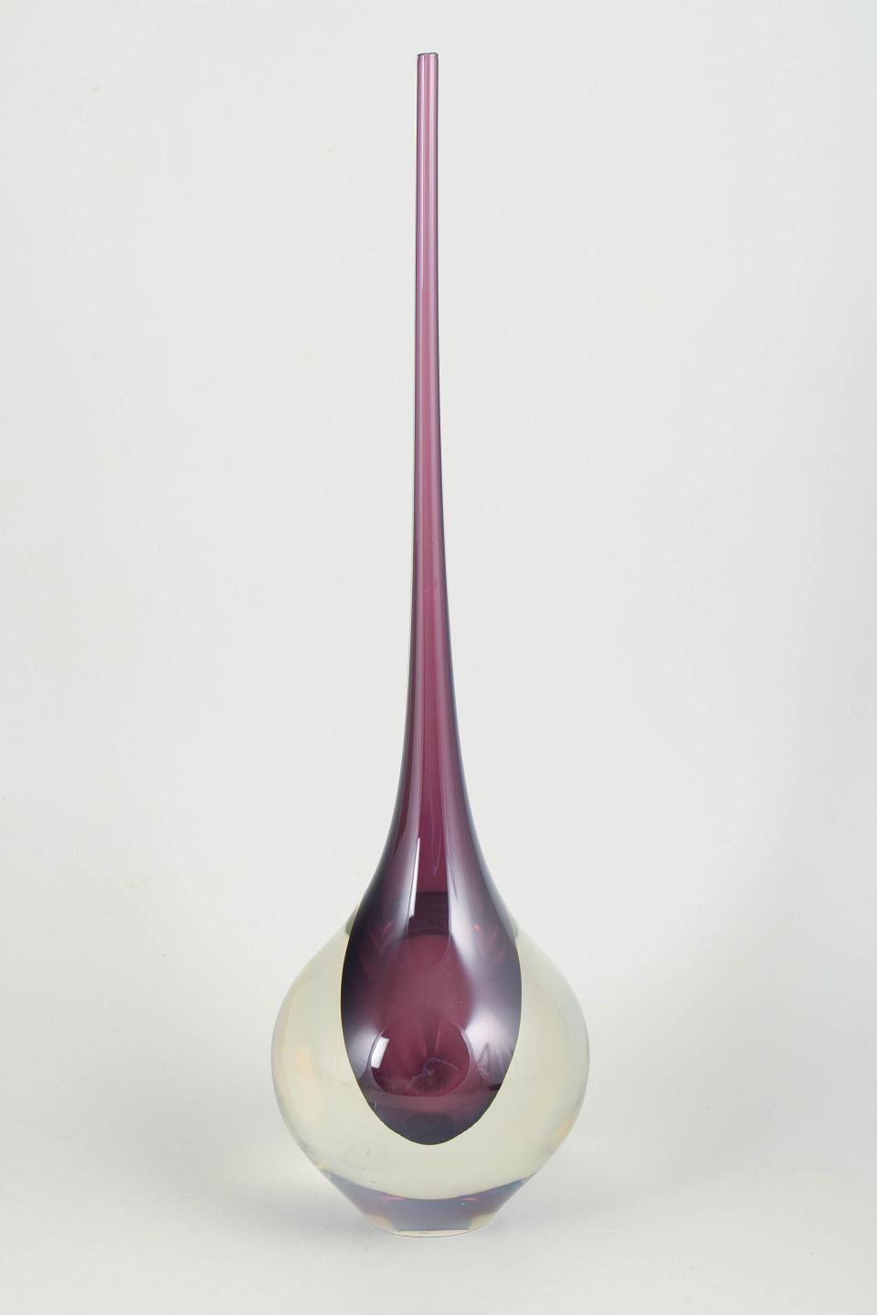 Elegant kunstglasvase i klart glas med indkapslet violet kerne og meget lang slank hals, udført i karakteristisk Murano-stil med skulpturel dråbeform.
