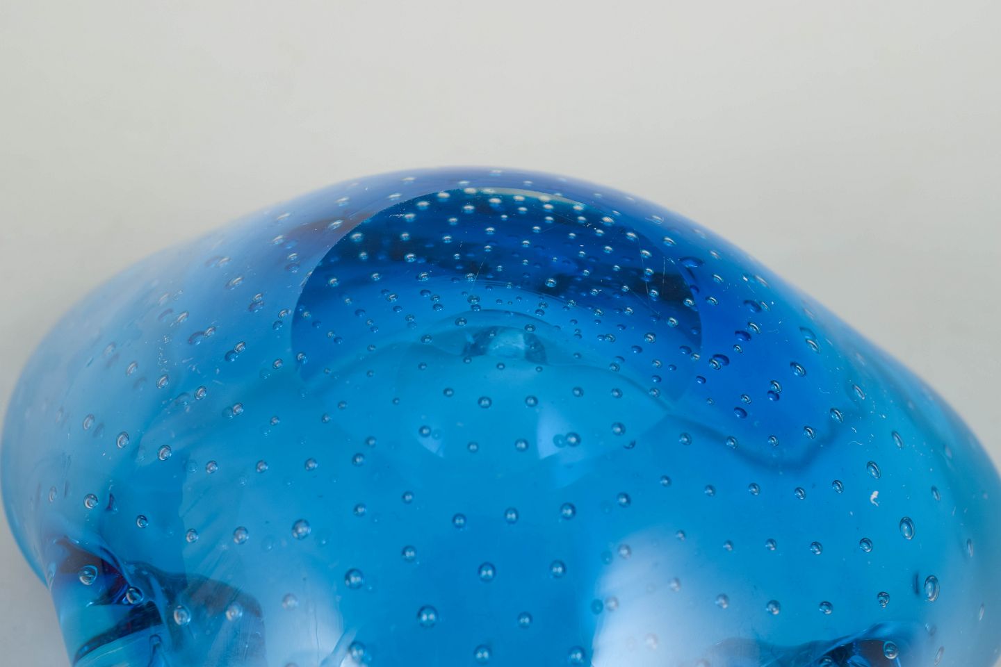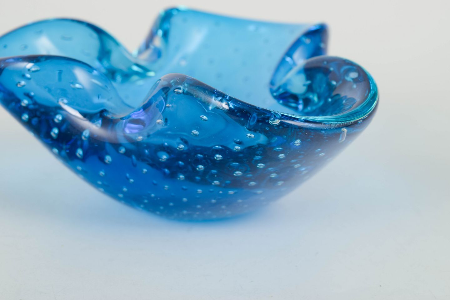 Organisk formet glasskål i klart blåt glas med indkapslede luftbobler og blødt bølgende rand, udført i den karakteristiske italienske kunstglasstil fra Murano.