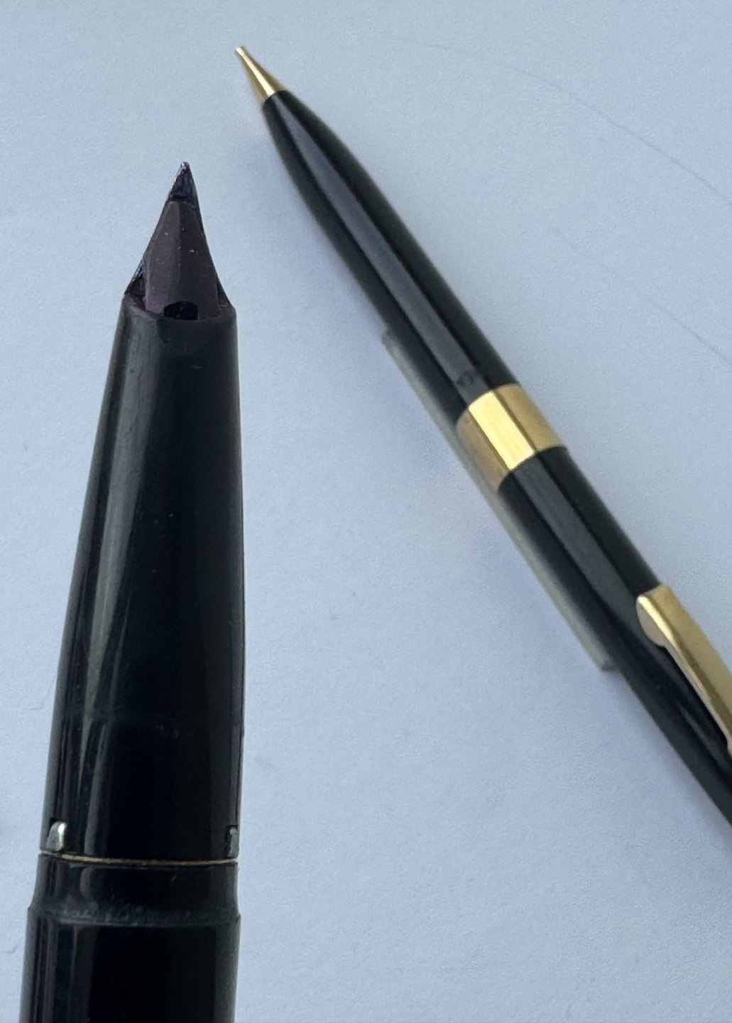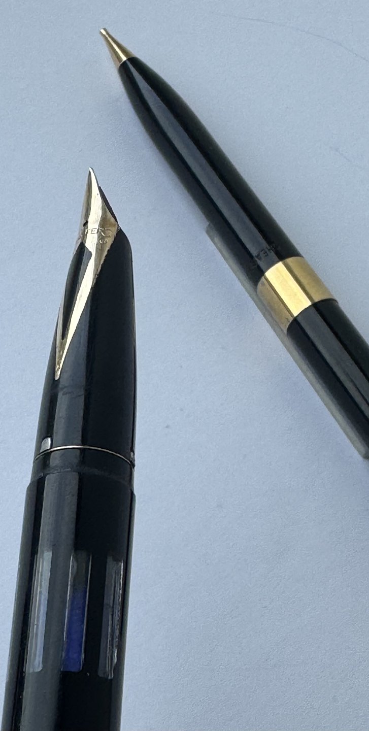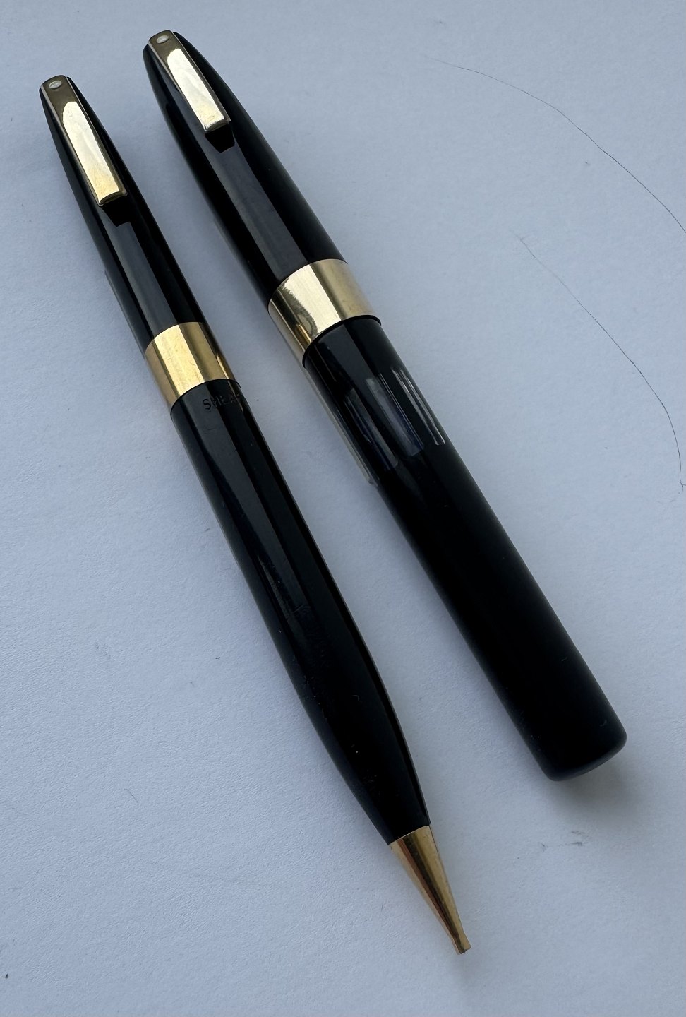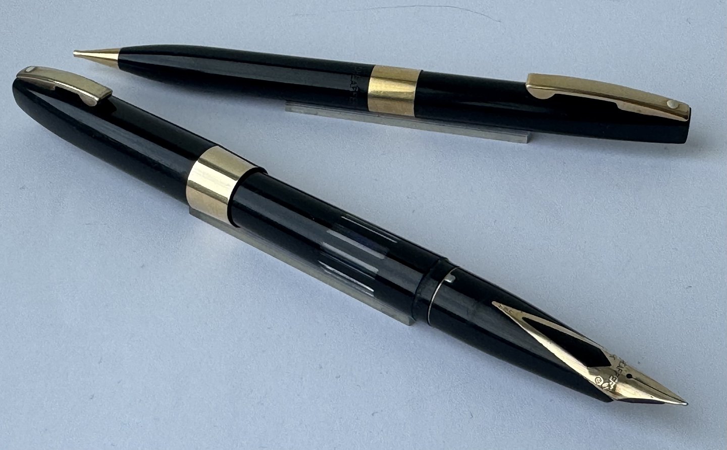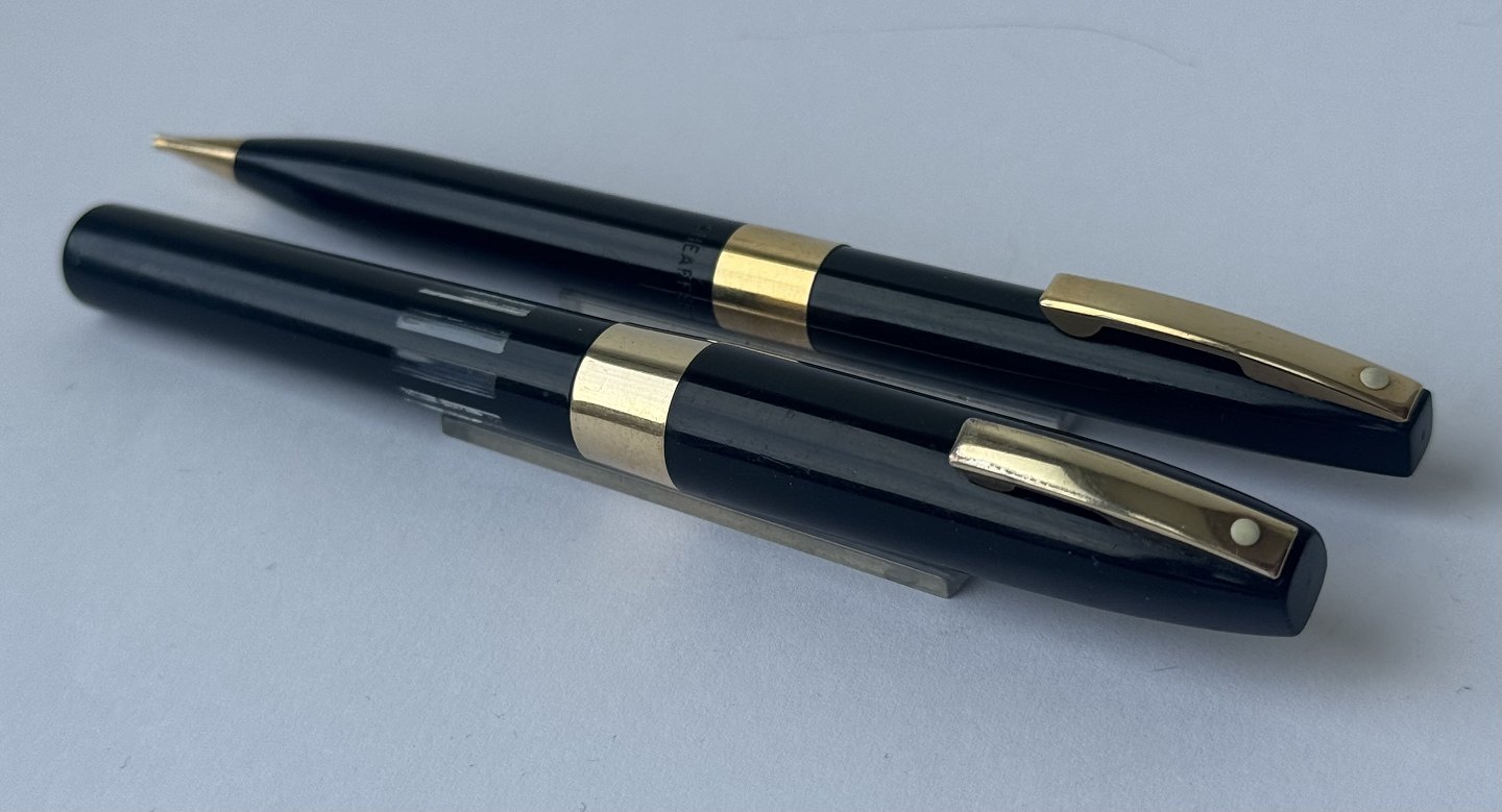 Alle dele originale Sheaffers inklusiv en 14 karat guldspids. Fyldepennen er 12 cm lang og skrueblyanten er 12,8 cm lang.