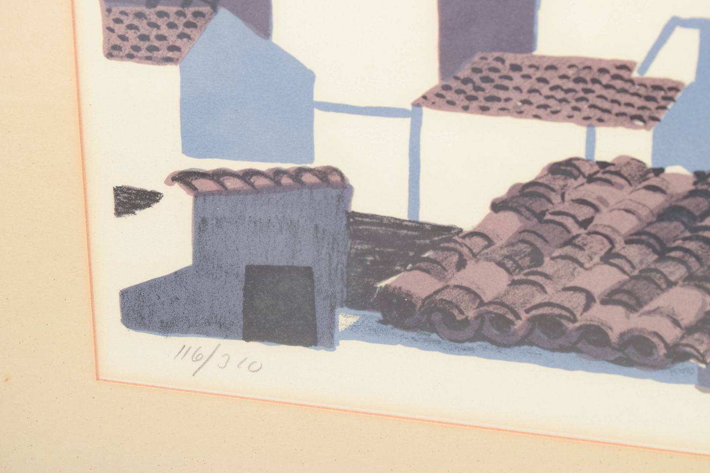 Grafisk komposition med stiliseret bymotiv og figurative elementer udført som farvelitografi, signeret i blyant og nummereret 116/310.