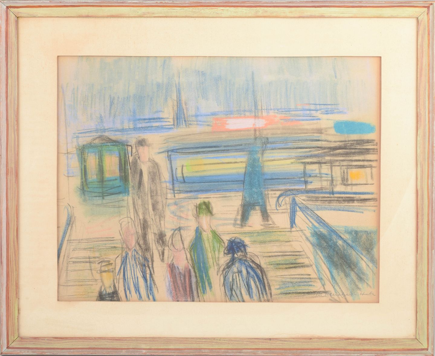 Ekspressivt motiv med figurer og arkitektoniske elementer udført i farvekridt på papir, signeret B. Klercker nederst til højre. Kompositionen viser en stiliseret byscene med mennesker og konstruktioner gengivet i et frit, modernistisk formsprog og en let, atmosfærisk farveholdning.