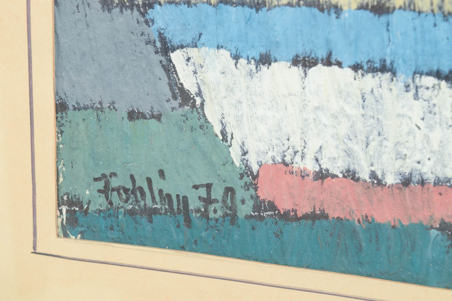 Abstrakt landskabskomposition udført i olie på papir med brede, strukturerede penselstrøg i blå, hvide og grønne toner med et horisontalt bånd i rødligt nuance. Kompositionen har en tydelig horisontal opbygning, der giver associationer til hav og kystlandskab.