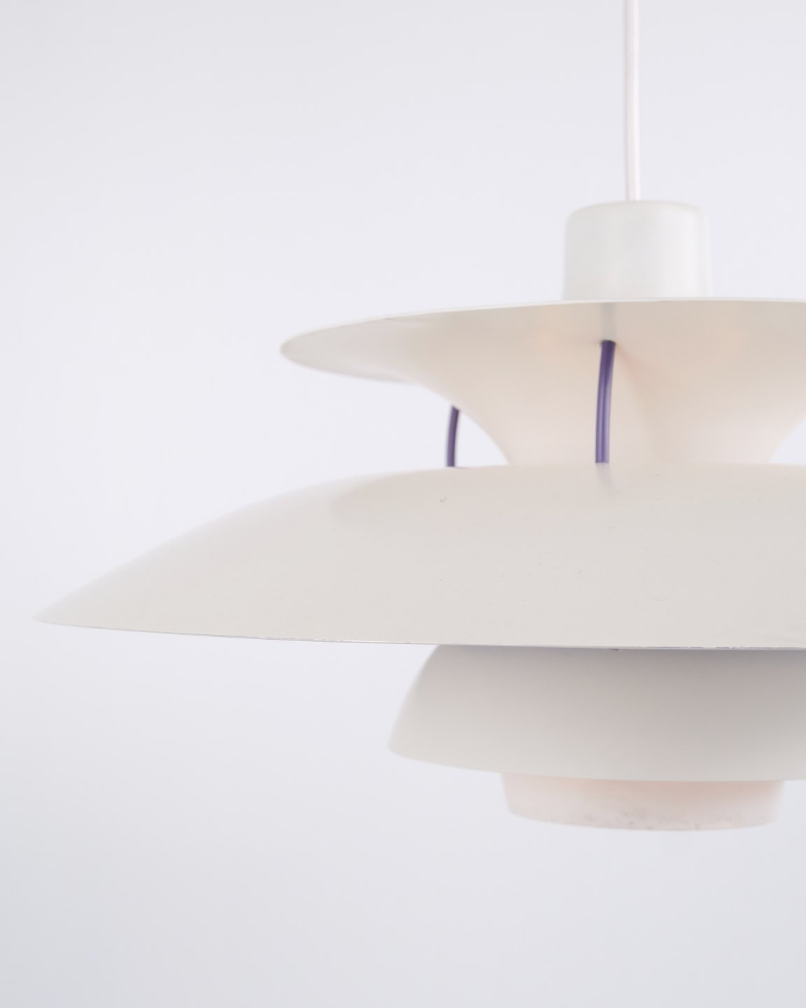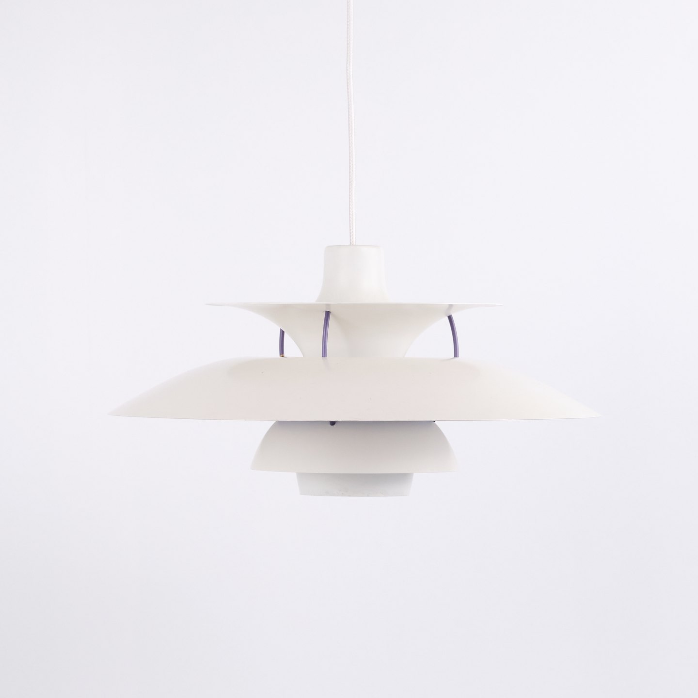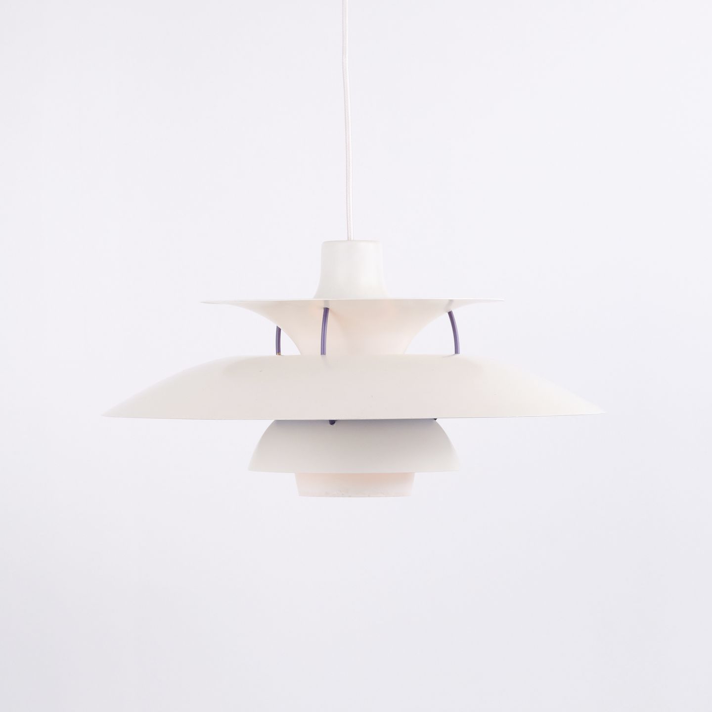PH 5 pendel i hvidlakeret metal fra Louis Poulsen designet af Poul Henningsen. Klassisk dansk lampe med blændfrit og funktionelt lys.