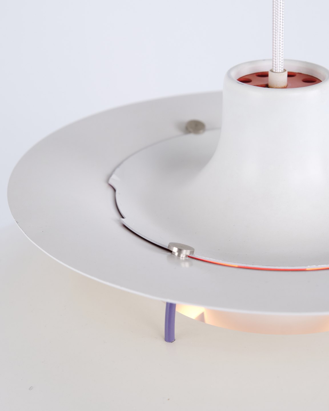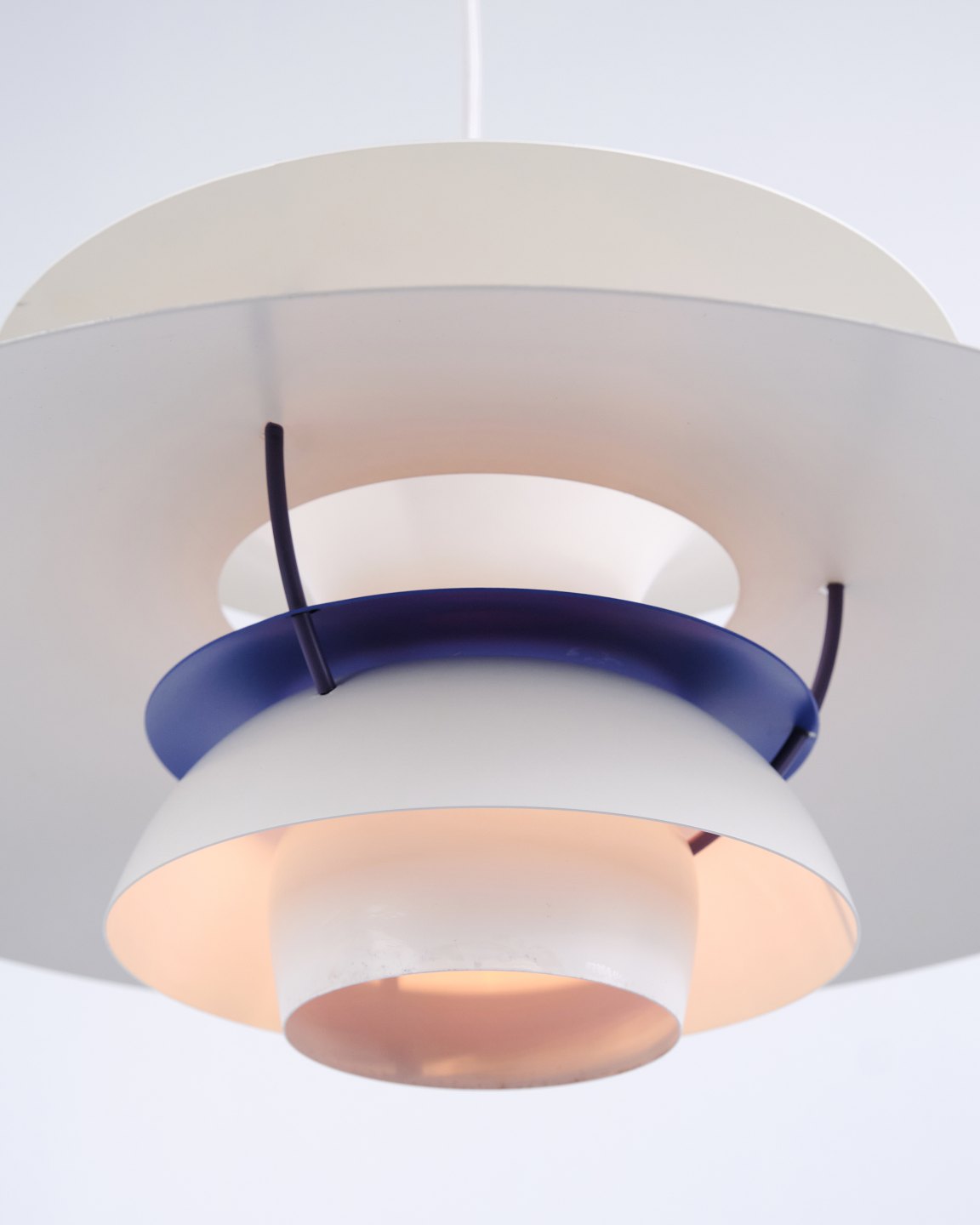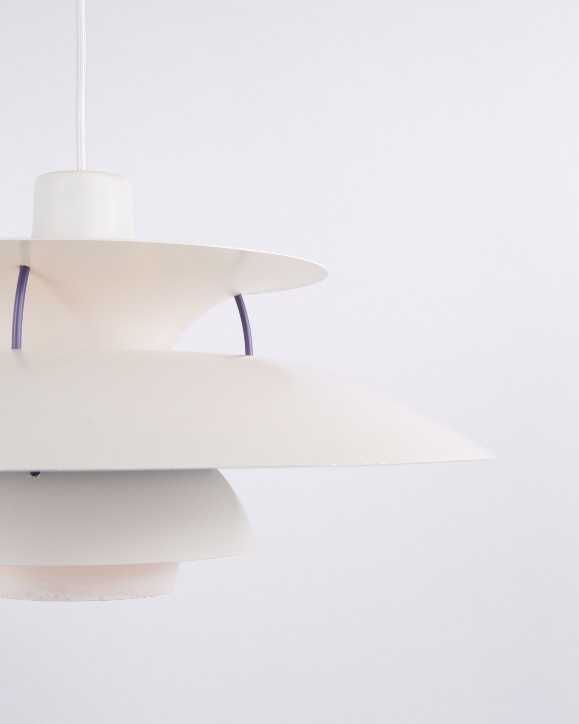 PH 5 pendel i hvidlakeret metal fra Louis Poulsen designet af Poul Henningsen. Klassisk dansk lampe med blændfrit og funktionelt lys.
