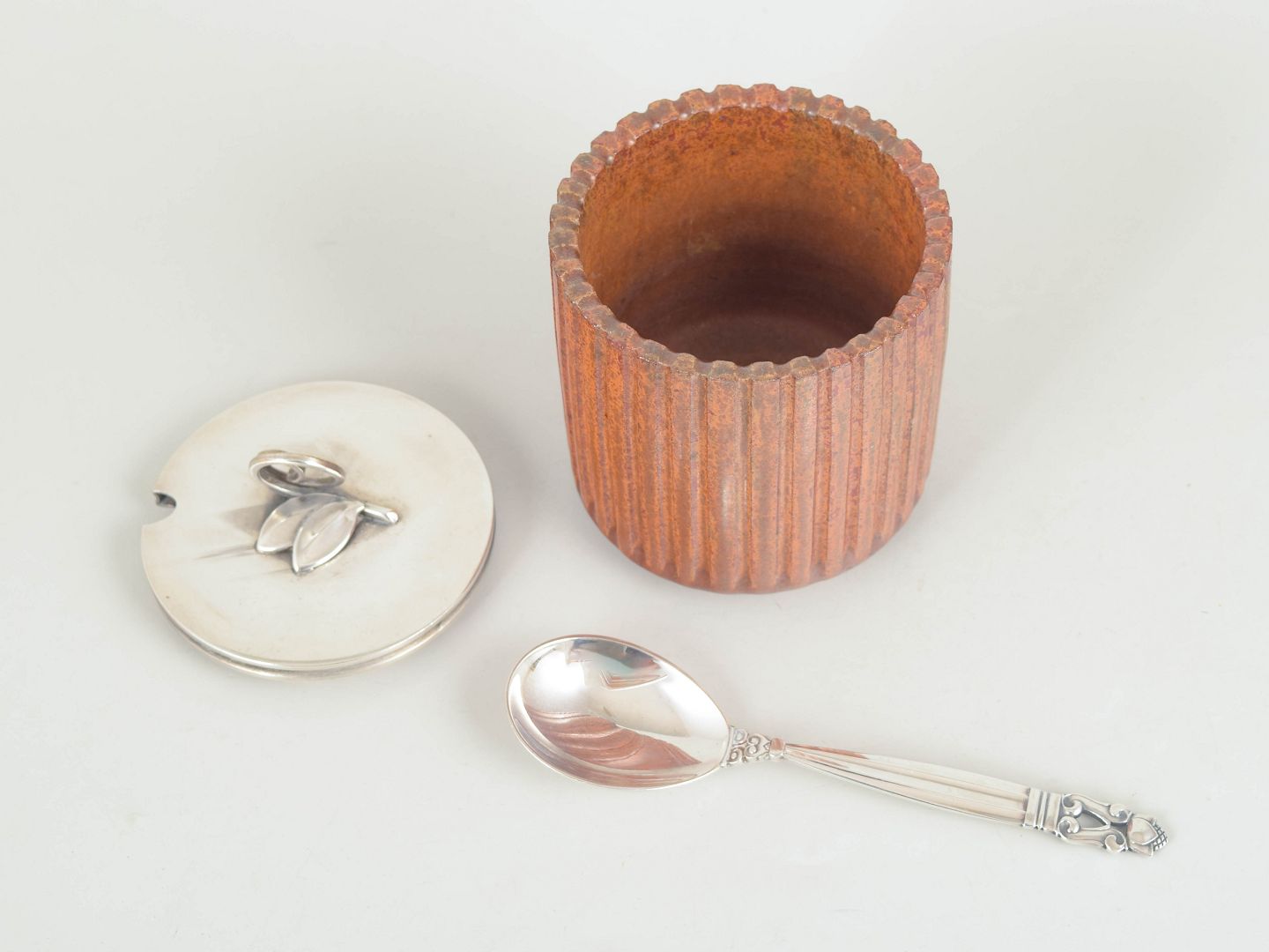 Hånddrejet cylindrisk stentøjskrukke med modelnummer 129, udført med lodret riflet korpus og varm rødbrun glasur med levende overfladespil. Monteret med låg samt ske fra Georg Jensen i Konge-mønster, udført i 1940’erne i et stilrent art deco udtryk.