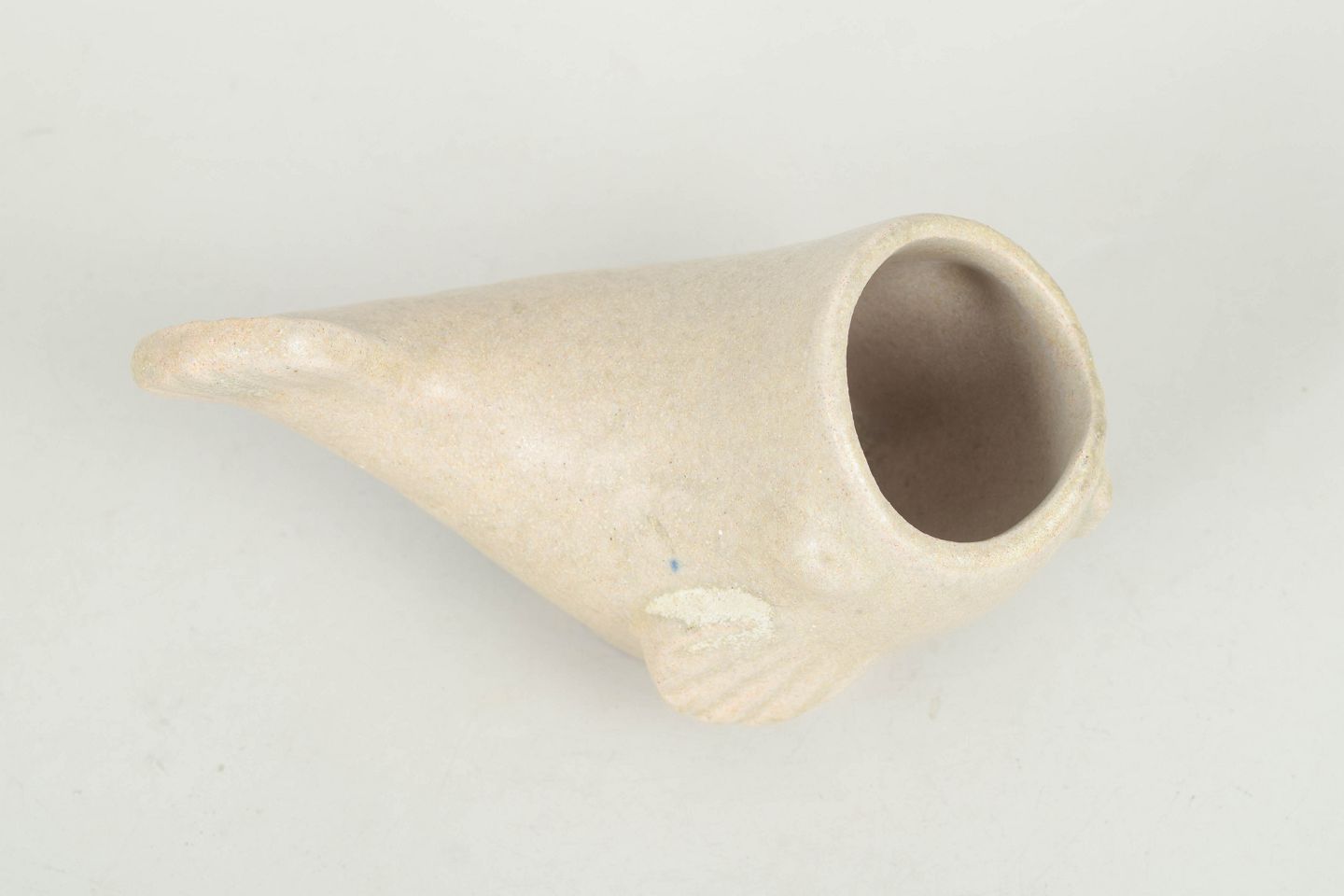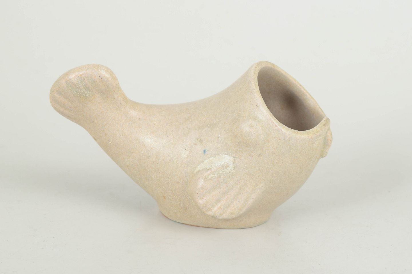 Organisk formet fisk i hånddrejet stentøj med blød, afrundet form og lys, mat glasur med diskret spil i overfladen. Et karakteristisk eksempel på Arne Bangs naturalistiske og skulpturelle formsprog fra 1940’erne.