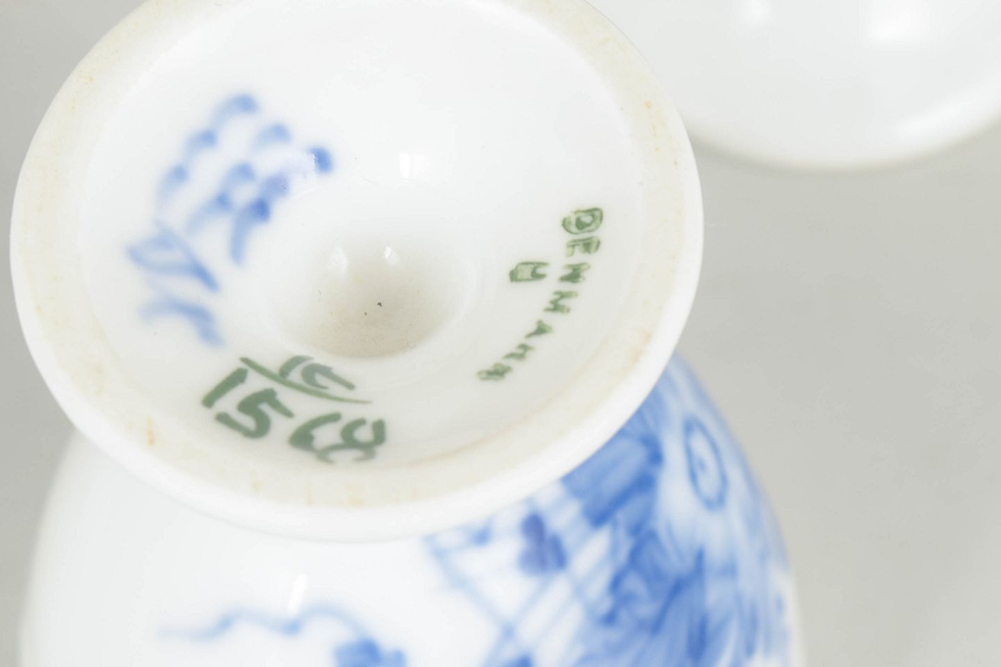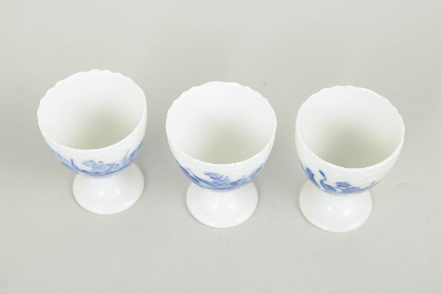 Sæt bestående af tre æggebægre i porcelæn med håndmalet blå blomsterdekoration i relief. Modelnummer 10/1568, 1. sortering, fra tidligt 1900-tal.