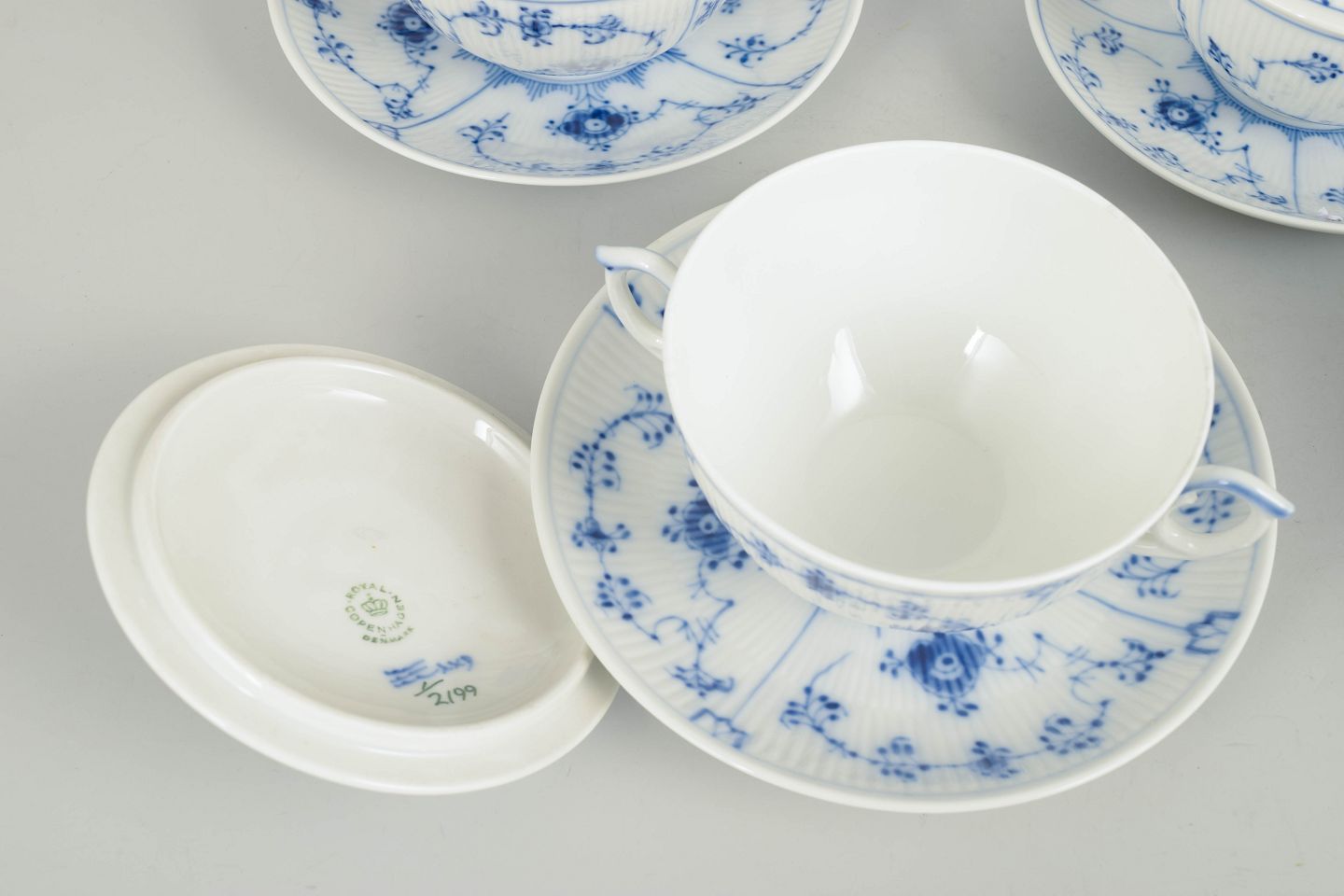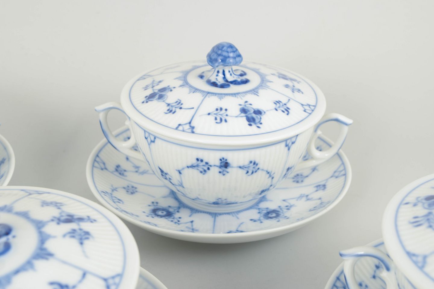 Royal Copenhagen, musselmalet riflet sæt af fire bouillonkopper med underkopper.