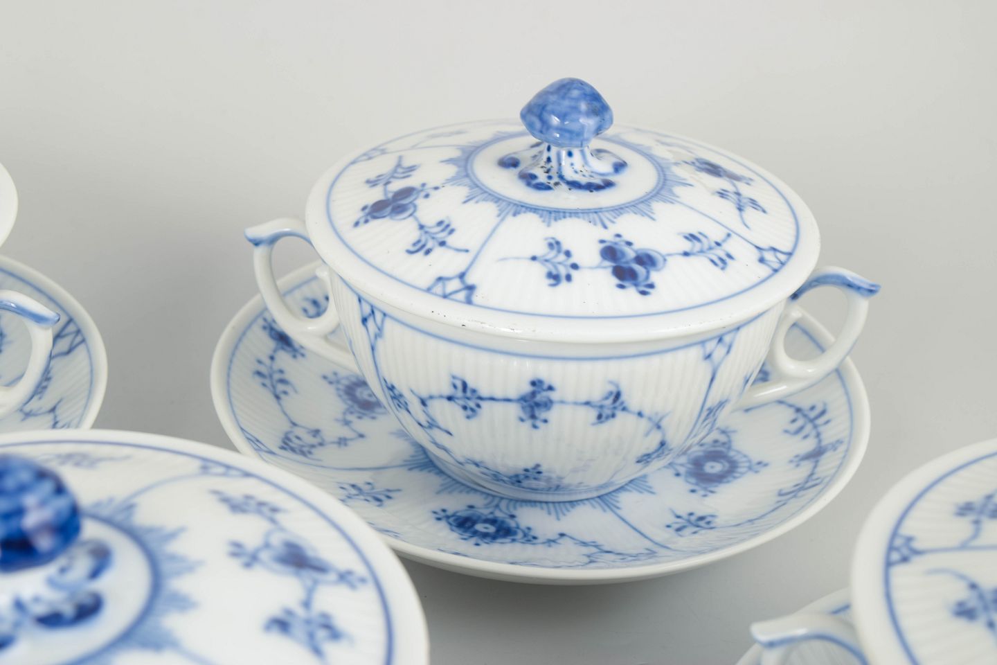 Royal Copenhagen, musselmalet riflet sæt af fire bouillonkopper med underkopper.
