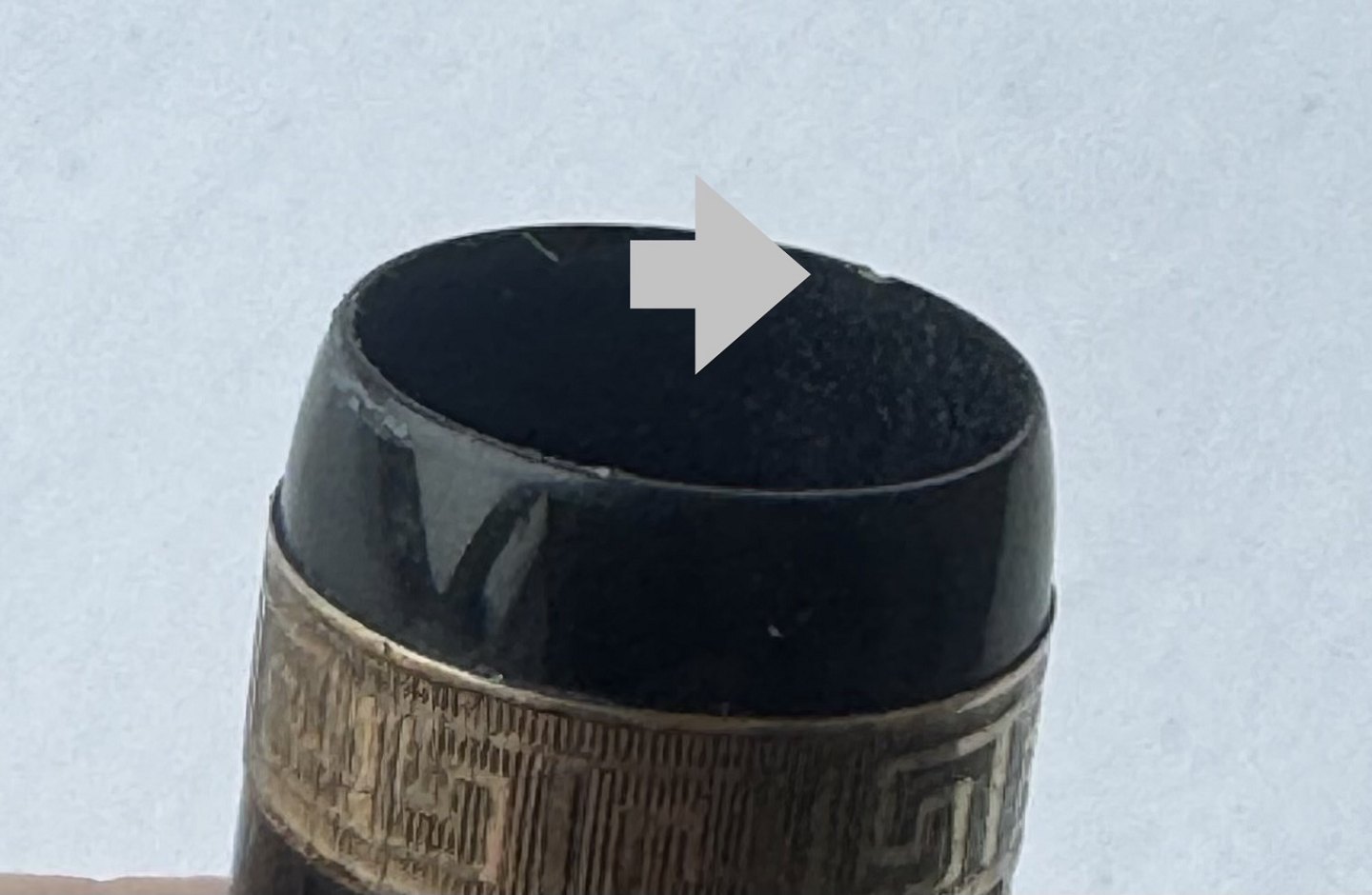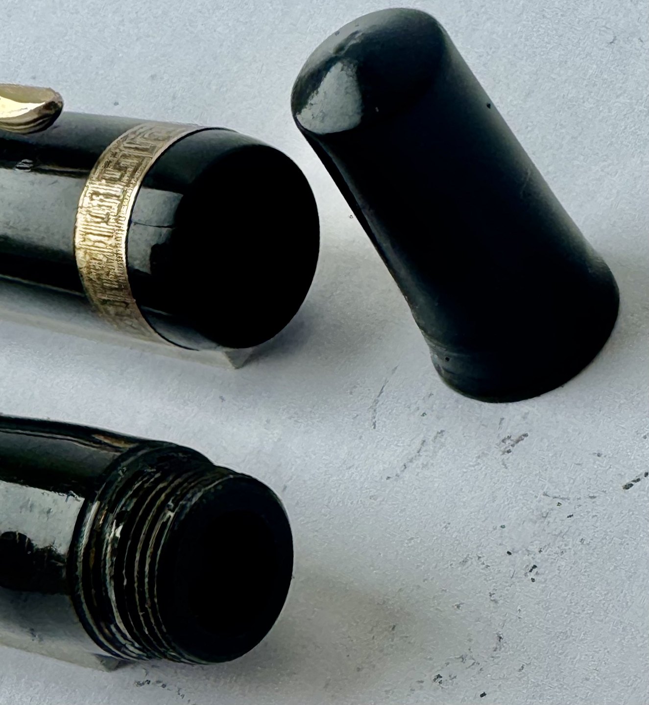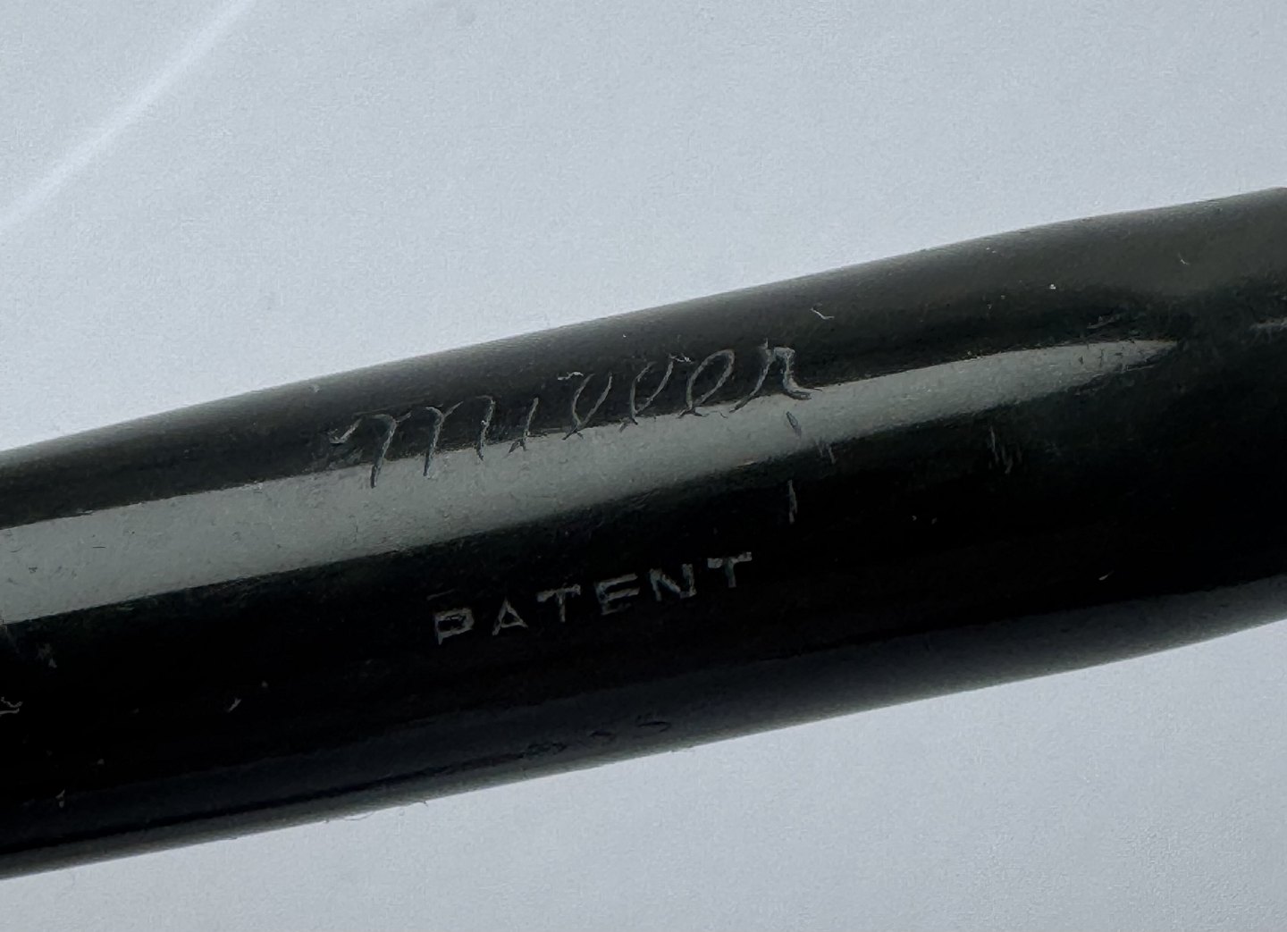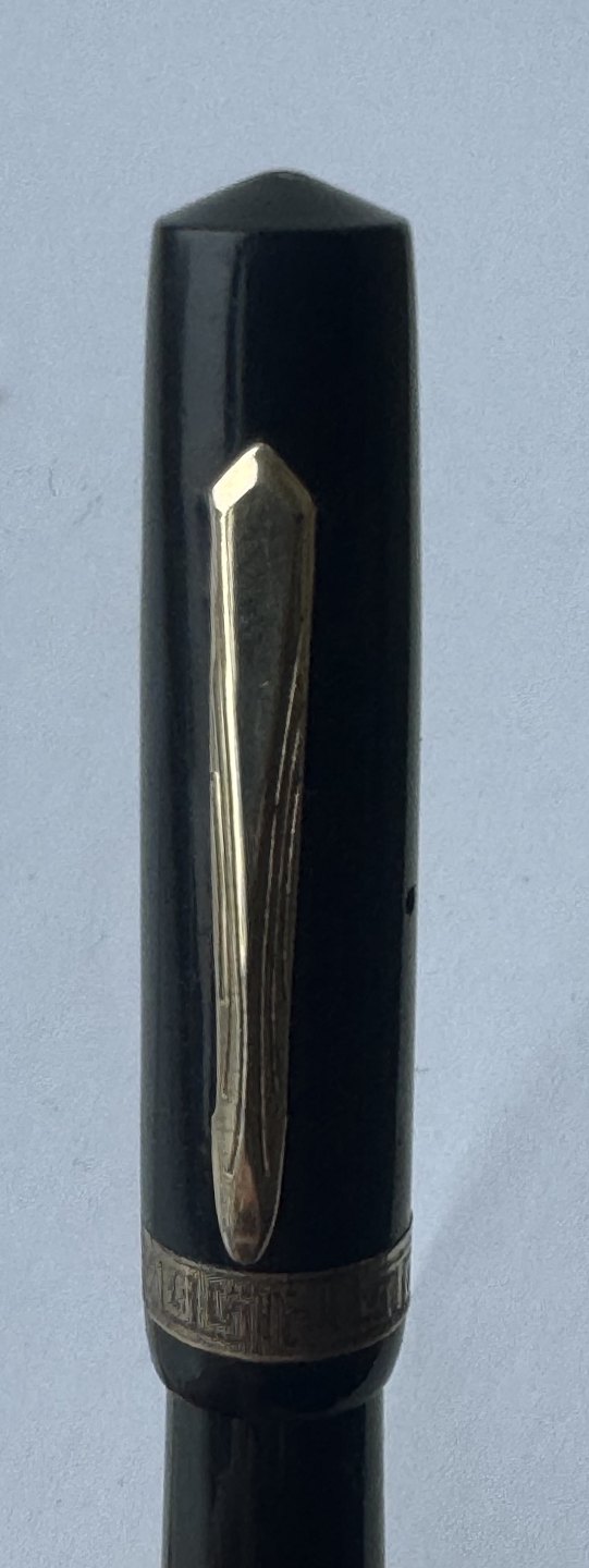 Der skal indsættes en ny gummisæk før end pennen igen kan optage blæk og skrive. Bortset fra et lille skår på hætten (se foto) er pennen i god stand. Alle dele originale til denne model. Længde 12,6 cm