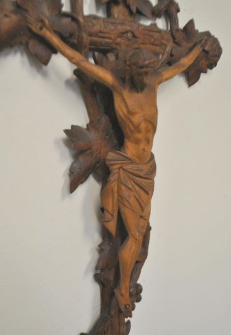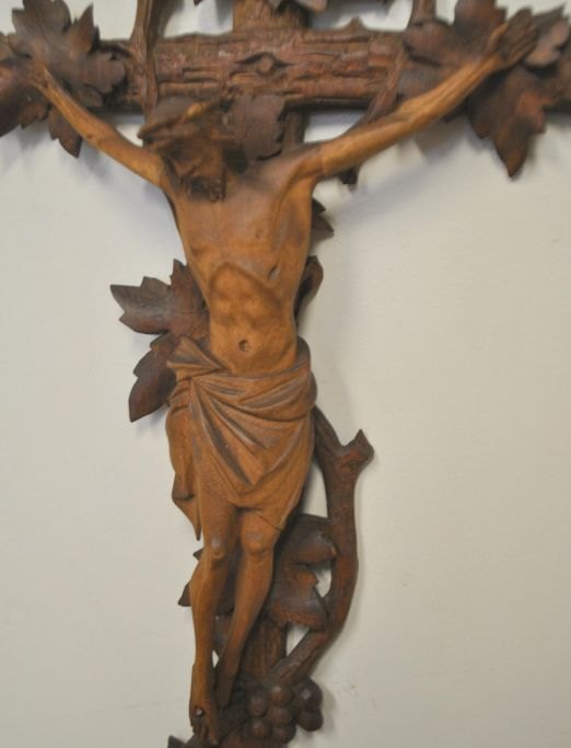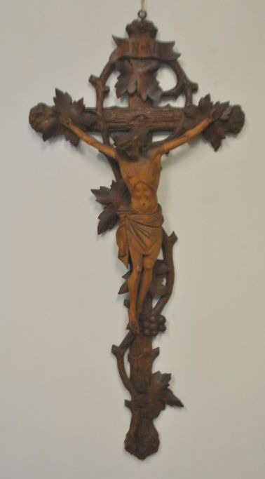 Carved wooden crucifix, 19th century Germany. Cross decorated with vine, grapes and bark. H: 48 cm. W.: 22 cm.
