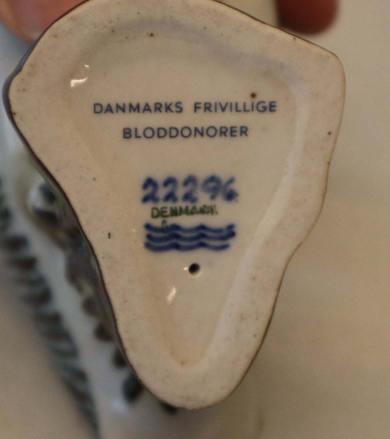 Royal Copenhagen stentøj: Fugl 22296 Pelikan Jeanne Grut november 1967 I fin og hel stand Danmarks Frivillige Bloddonorer har efter tapning nr. 100 fået en sådan stentøjspelikan. Pelikanen er et symbolsk valg. Siden oldkristen tid har pelikanen optrådt som symbol på Kristus, der ofrede sig selv, udgød sit blod for menneskene. Det ved vi fra gamle skrifter, men også fra kalkmalerierne i mange af vores gamle kirker.