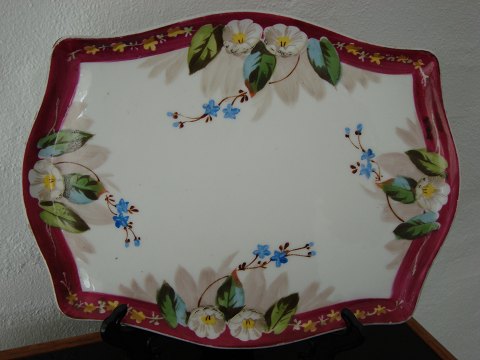 Gammel fransk Porcelænsbakke med floral dekoration og vinrød kant.