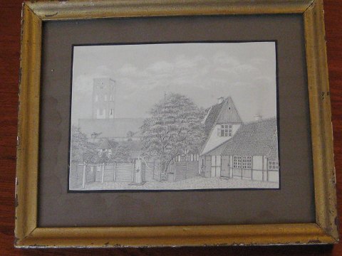 Ribe tegning i gl. ramme. Mål 17 x 20,5