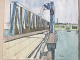 Akvarel signeret Villadsen 1979 - komposition med bro og bolværk.