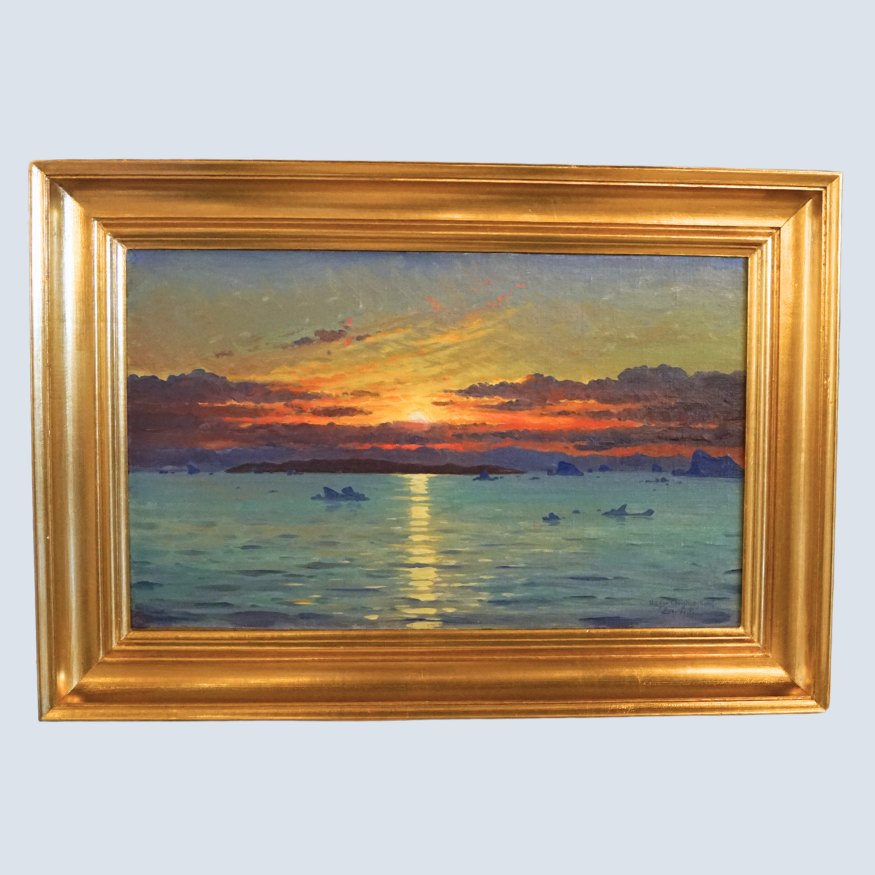 Emanuel A. Petersen Greenlandic oil painting with motif of sunset at Christianshaab / Qasigiannguit