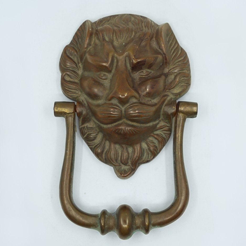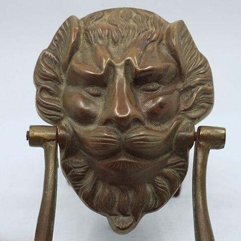 Door knocker in patinated bronze in the shape of a lion's head. From France, first half of the 20th century. L. 18.5 cm. W. 10 cm. Please contact us if you're looking for anything specific. What you see on our webside is just a small selection.