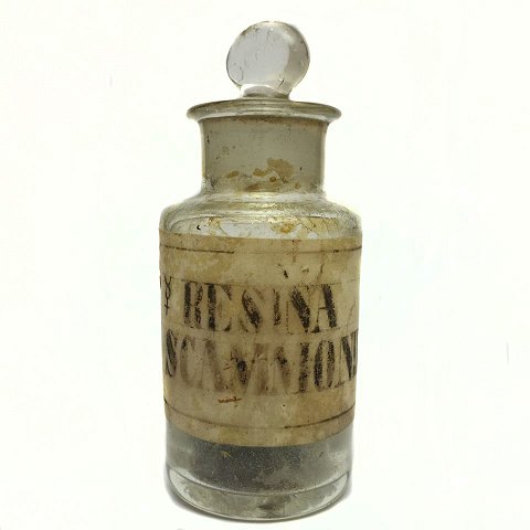 Apotekerflaske af glas med påsat etikette med teksten: "RESINA SCAMMONII". H. 11 cm. med låg.