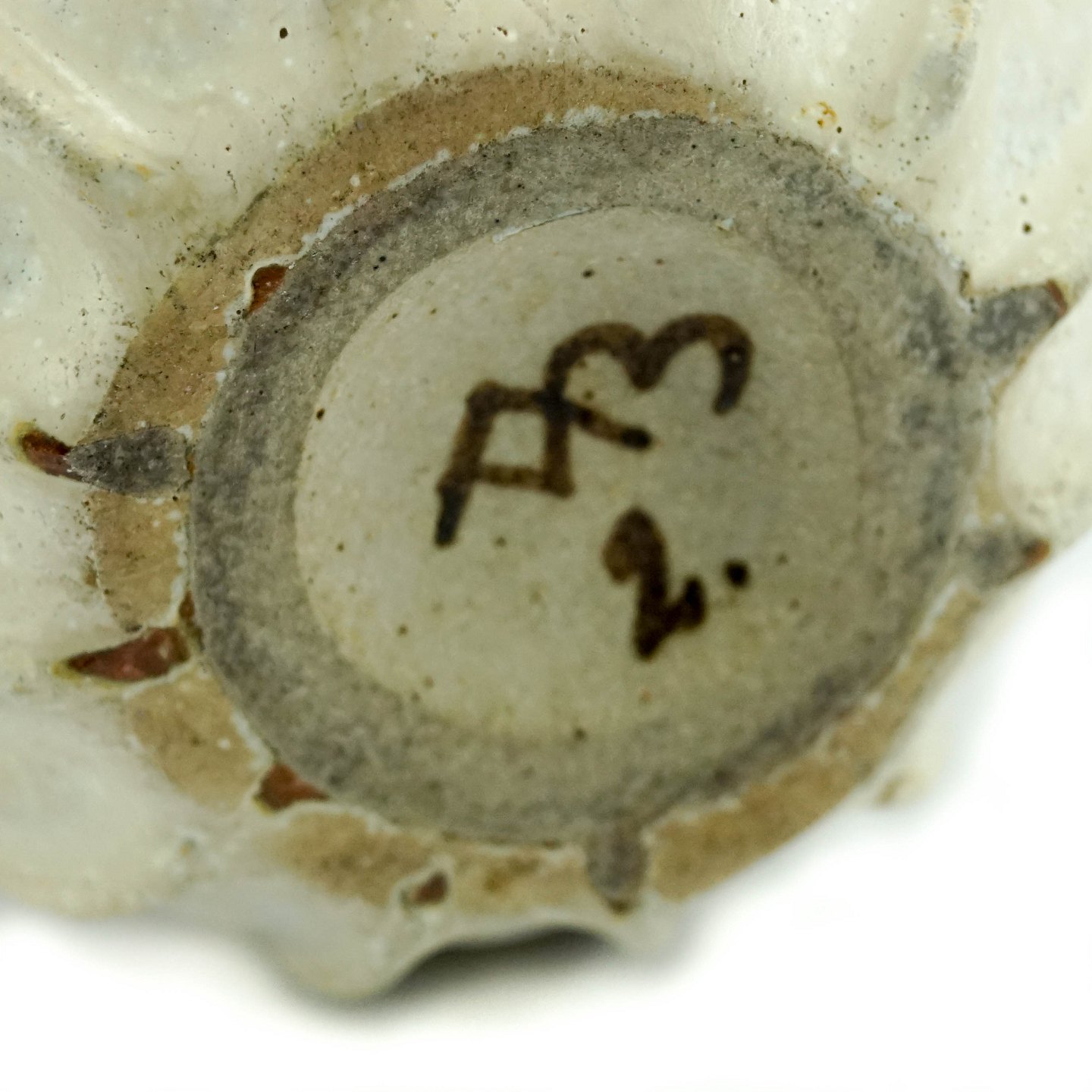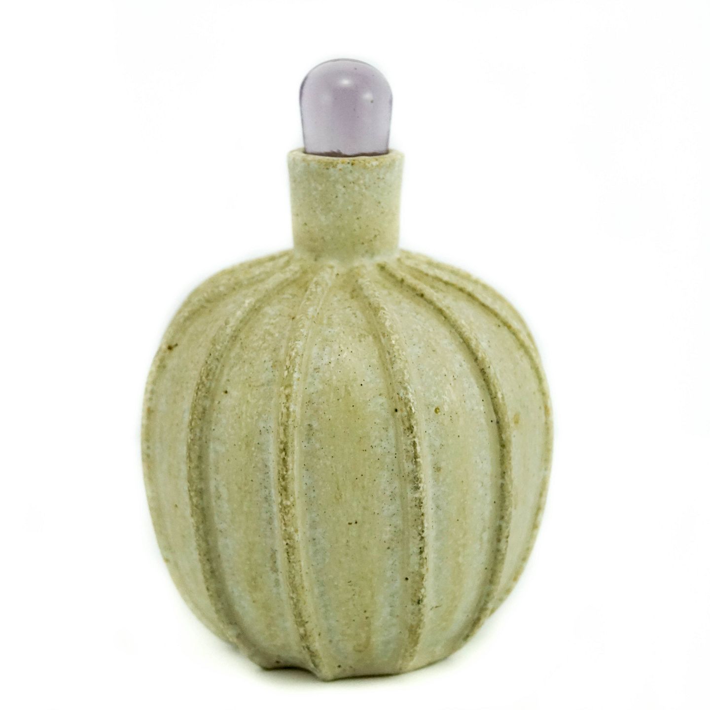 Arne Bang stentøj. Arne Bang; Vase af stentøj med glasprop. Vase modeleret med rillet mønster i relief samt lys glasur. Sign. monogram "AB" samt nummereret "2". H. 12,5 cm. Diam. 9 cm. Arne Bang, f. Frederiksberg 1901, d. Fensmark 1983.