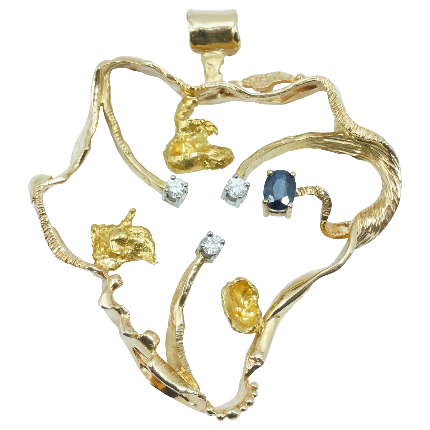 John Rørvig: A pendant of 18k gold set with a blue sapphire and three diamonds. H. 5,7 cm. W. 5,1 cm.