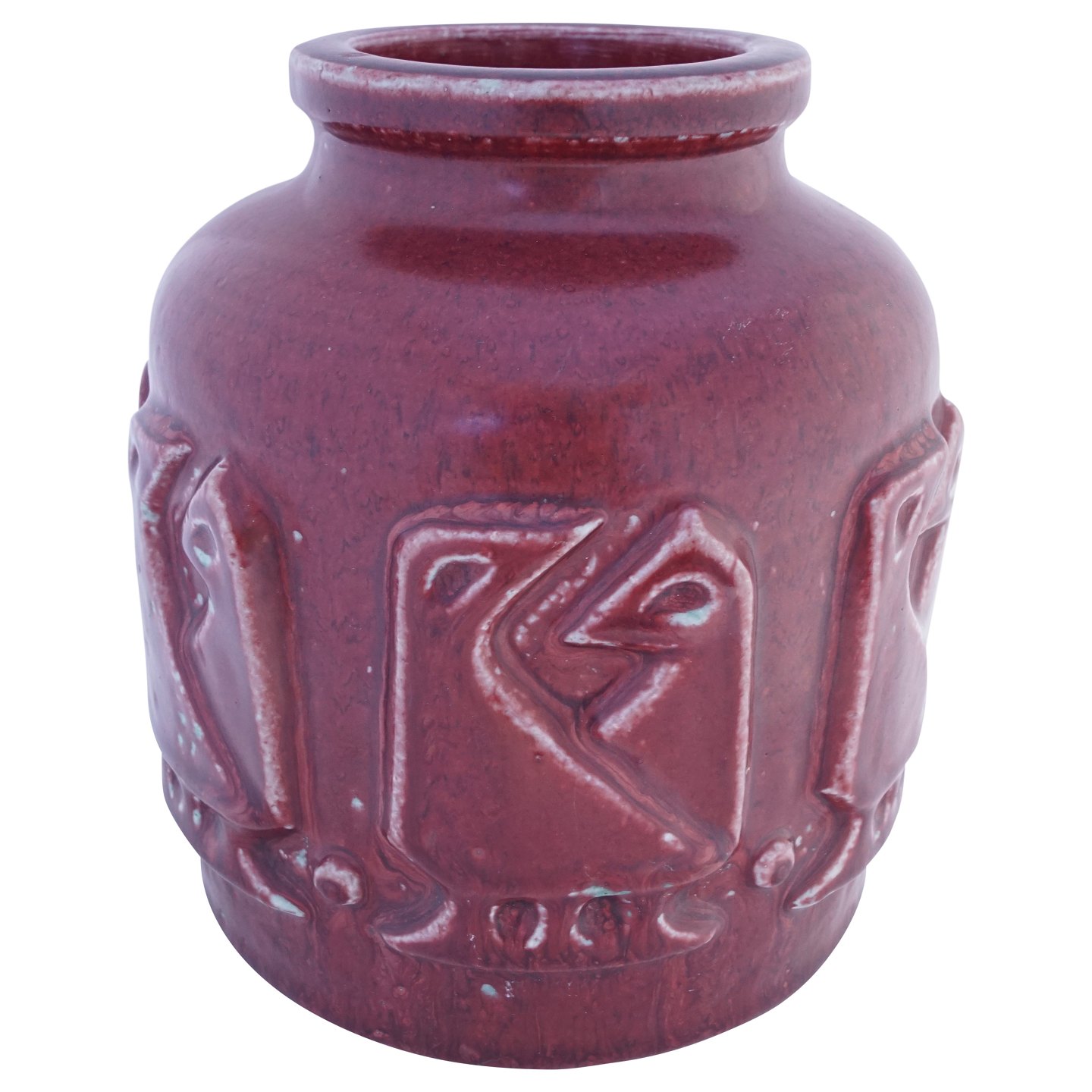 Jørgen Mogensen for Royal Copenhagen; En vase af stentøj, modelleret med fugle i relief. Dekoreret med okseblods glasur.