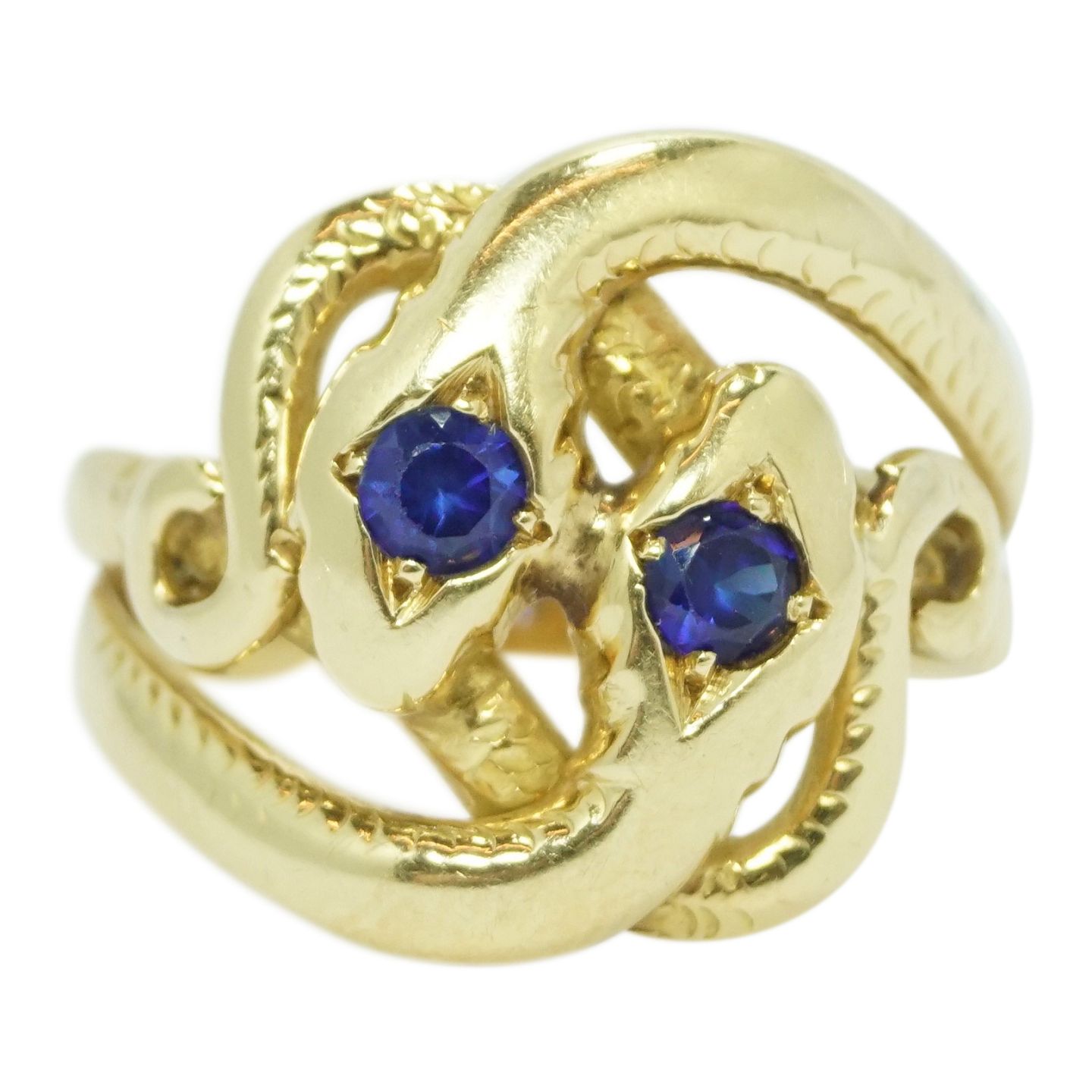 Ring af 14 kt. guld prydet med safirer. Form, som en slange med safirer, som øjne. Ring str. 59.