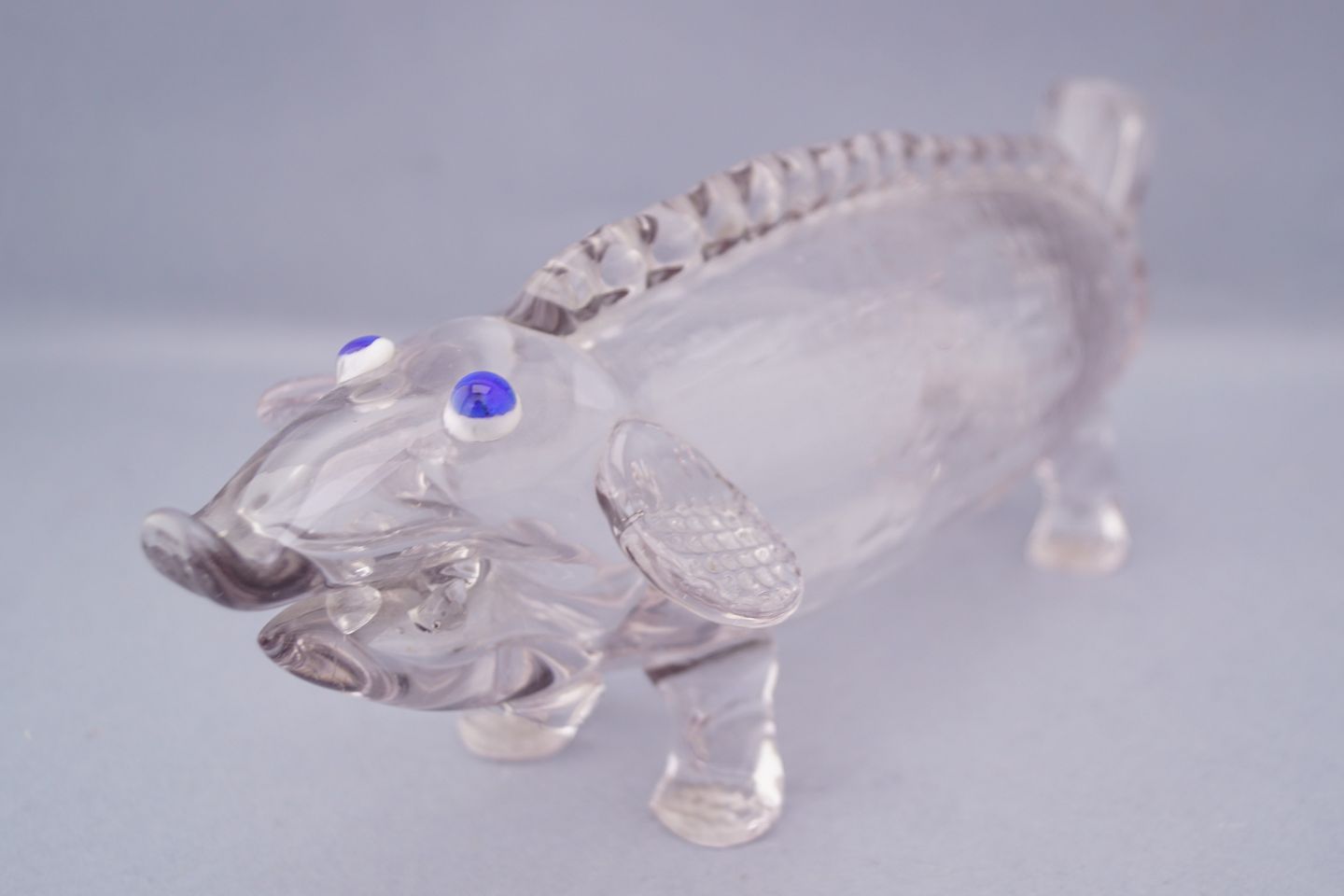 Holmegaard; snapsegris i glas. H. 10 cm. L. 25,5 cm. Antik Damgaard-Lauritsen køber guld, sølv og smykker - både til videresalg og til omsmeltning. Vi synes, det er synd at smelte den danske kulturarv.