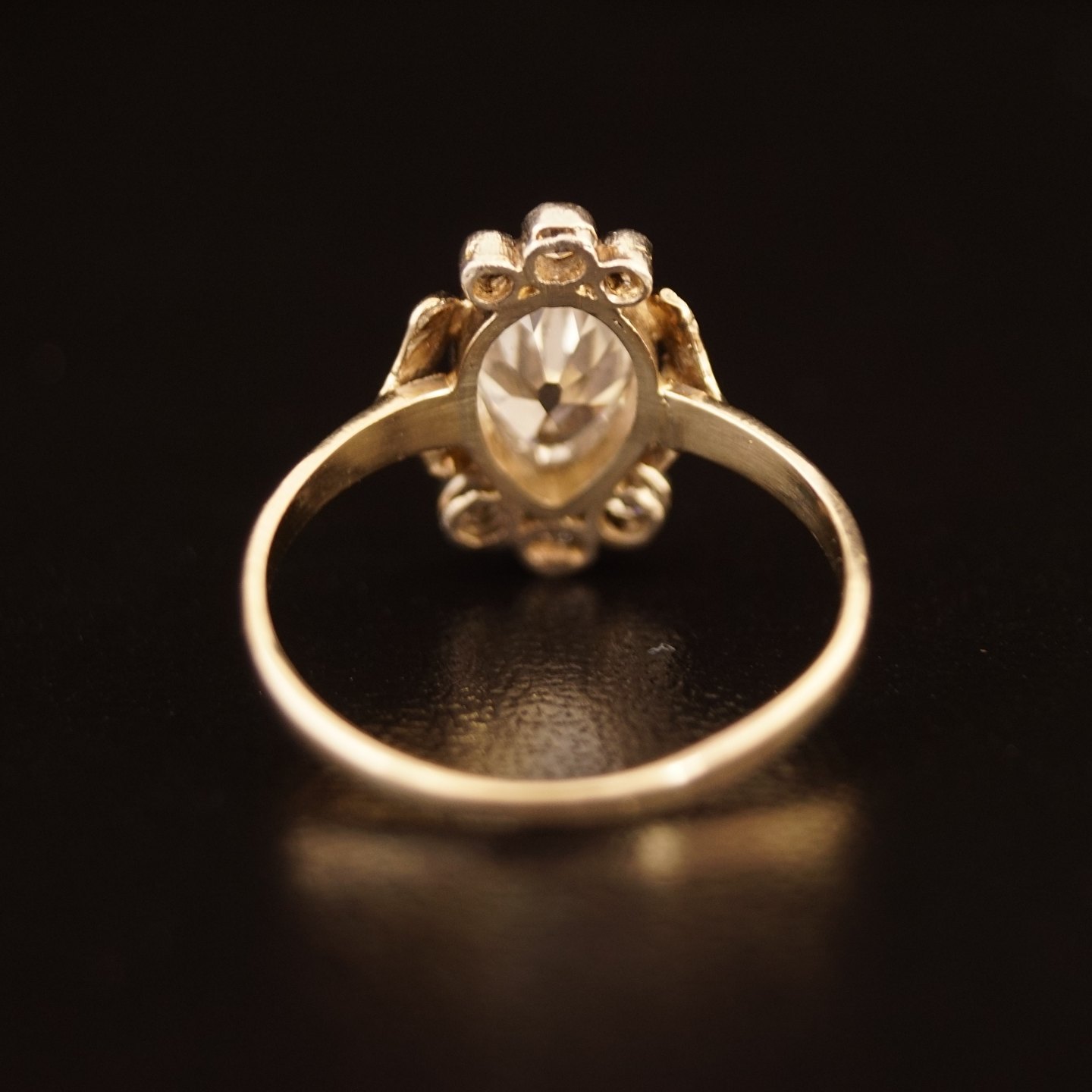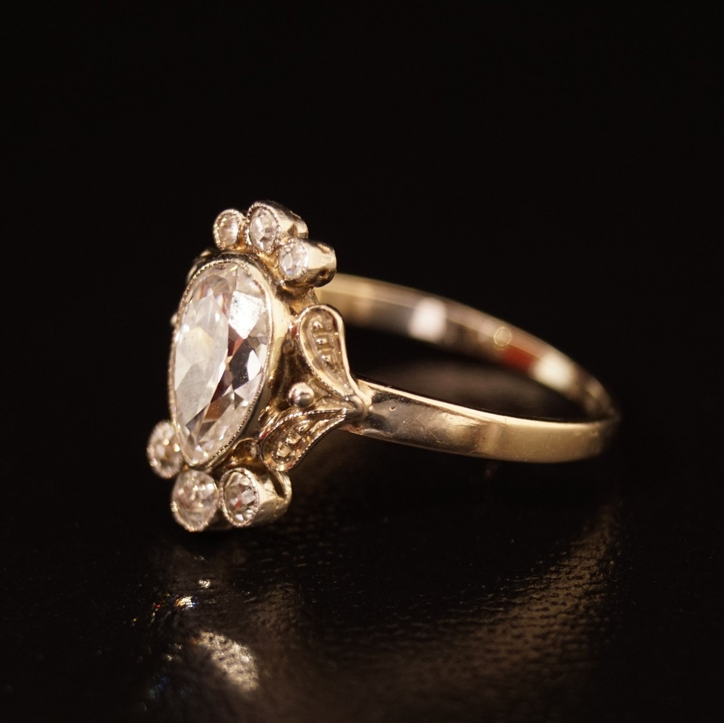 Brillantsmykke fra starten af 1900-tallet. Hvidguldsring af 14 kt. guld, prydet med en større dråbeformet brillant på 1,25 carat. Farve: Top Crystal, VVS. og 6 små diamanter i alt ca. 0,15 ct. Ring str. 55.