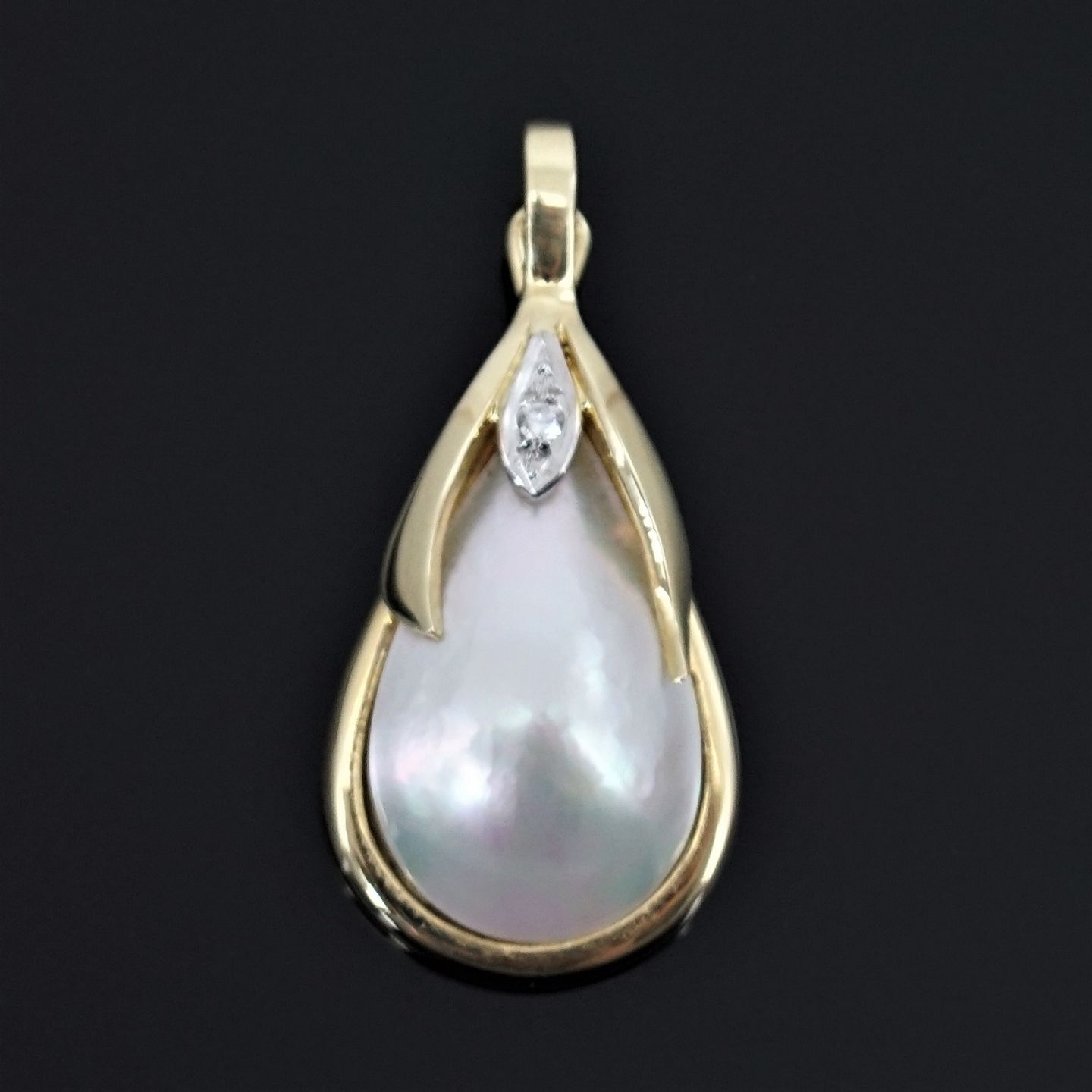 Vedhæng af 14 kt. guld og hvidguld prydet med én stor mabé perle samt diamant. H. 3,5 cm. B. 1,7 cm.