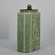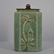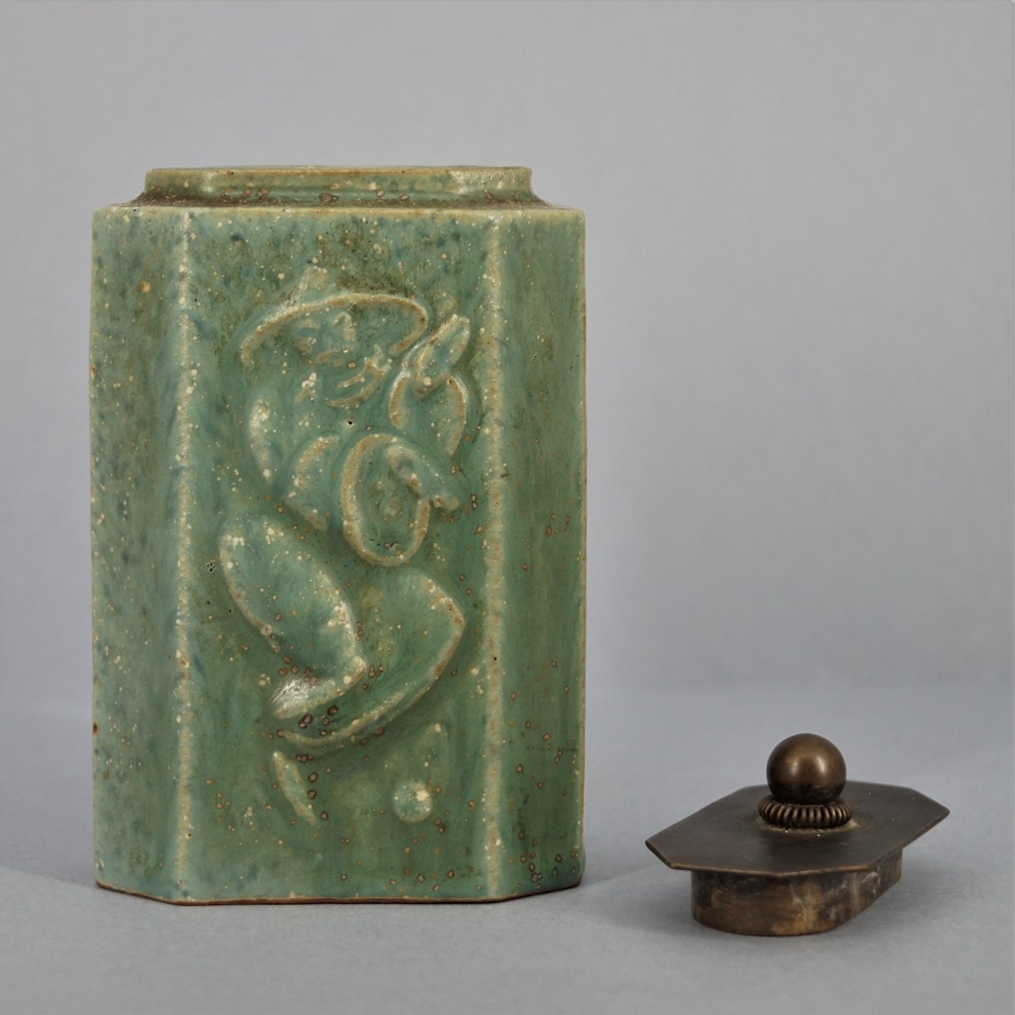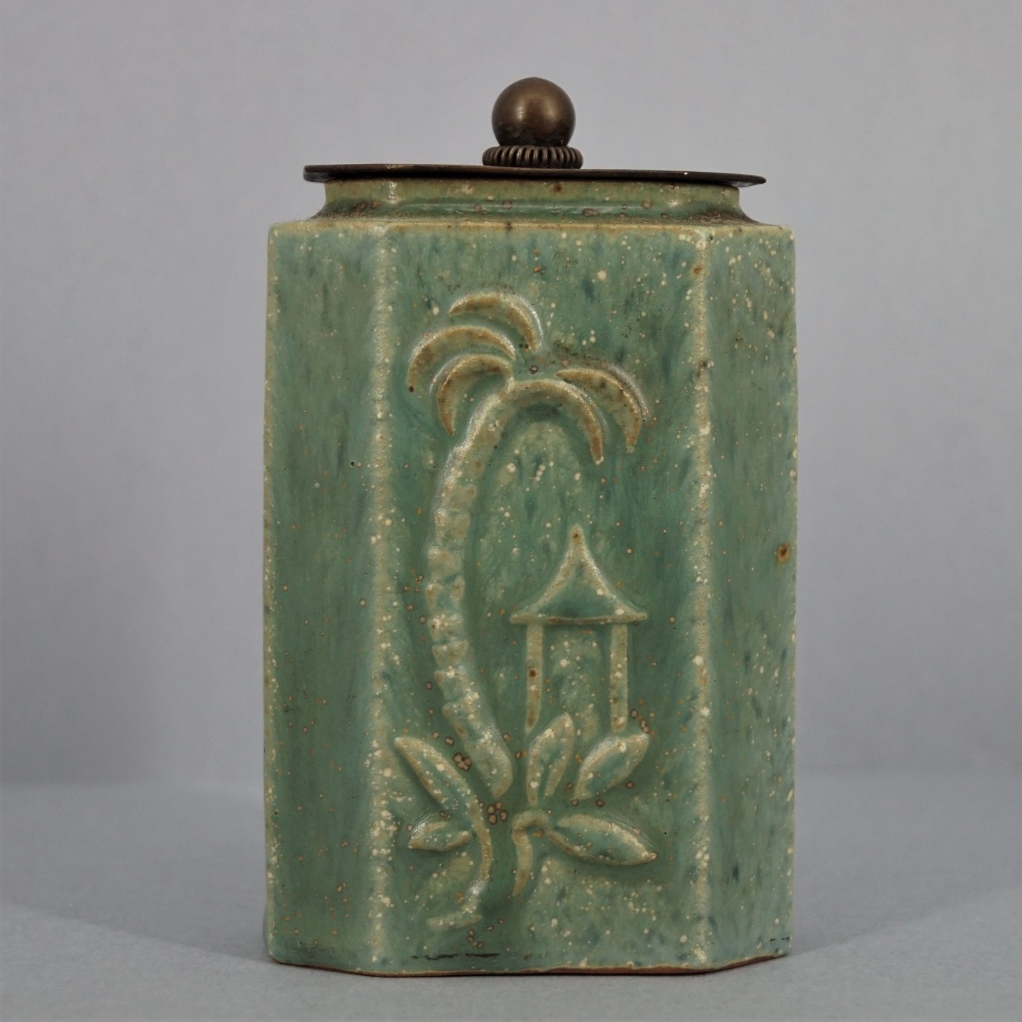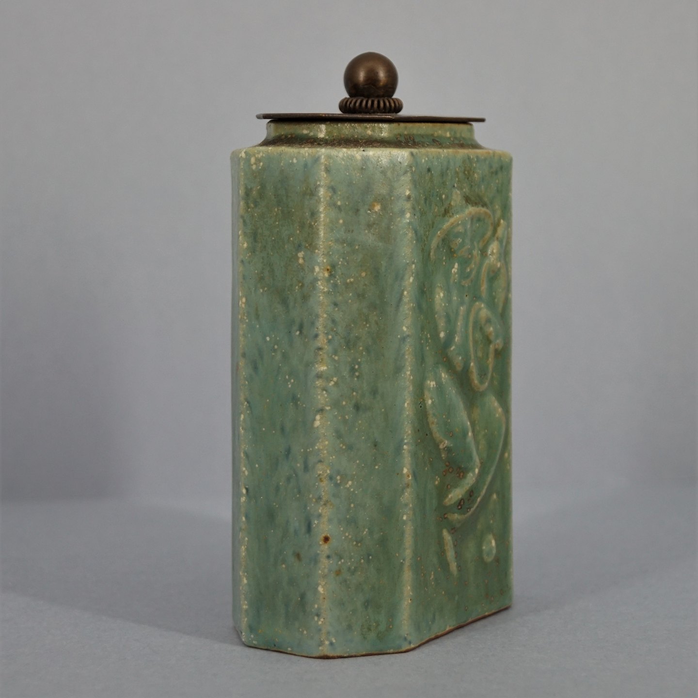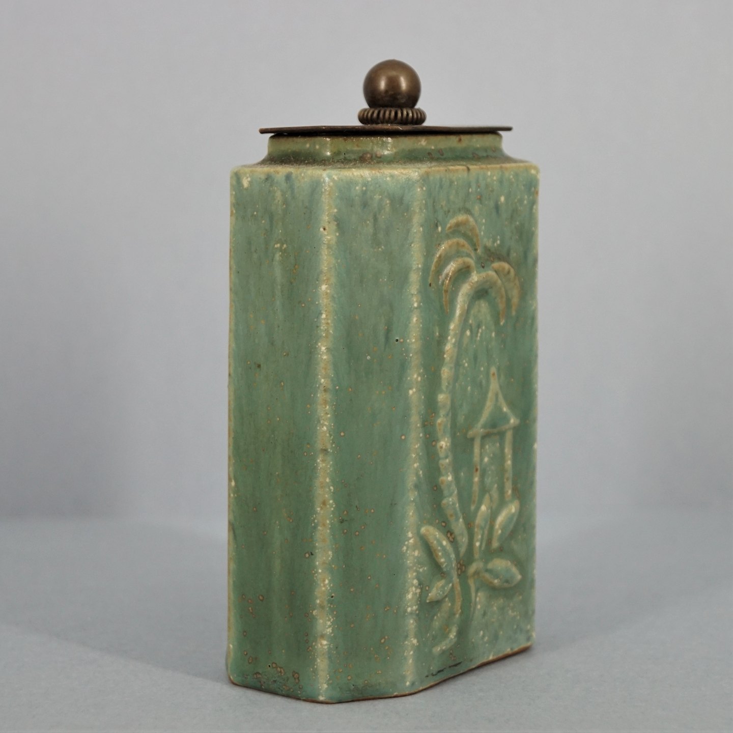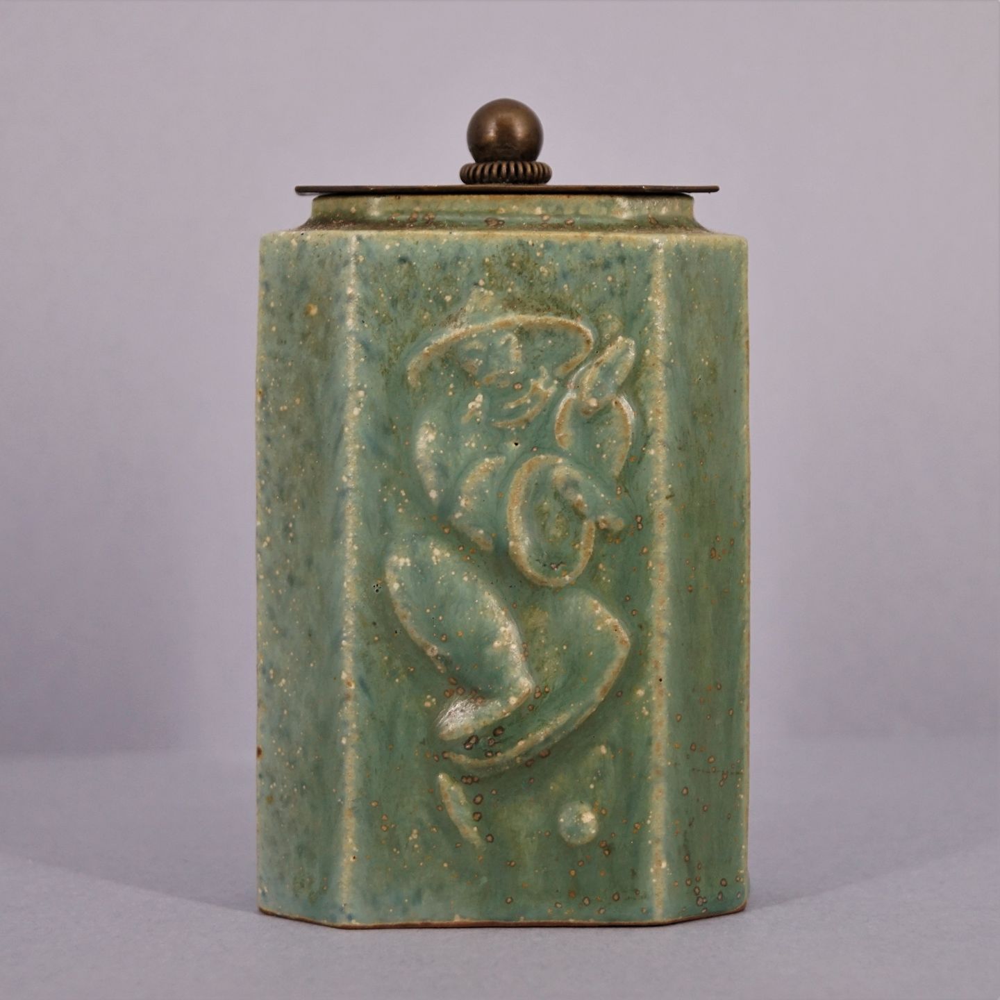 Arne Bang; Thekrukke af stentøj med bronze låg. Dekoreret med glasur i grøn, prydet med asistiske motiver i relief #6.