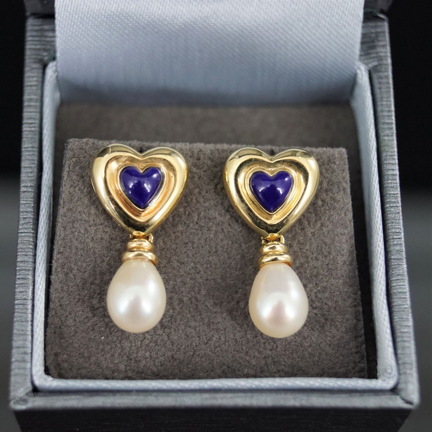 Hjerte ørestikker i 14 kt. guld prydet med lapis lazuli og hængende perler. H. 2,2 cm. B. 1,1 cm.