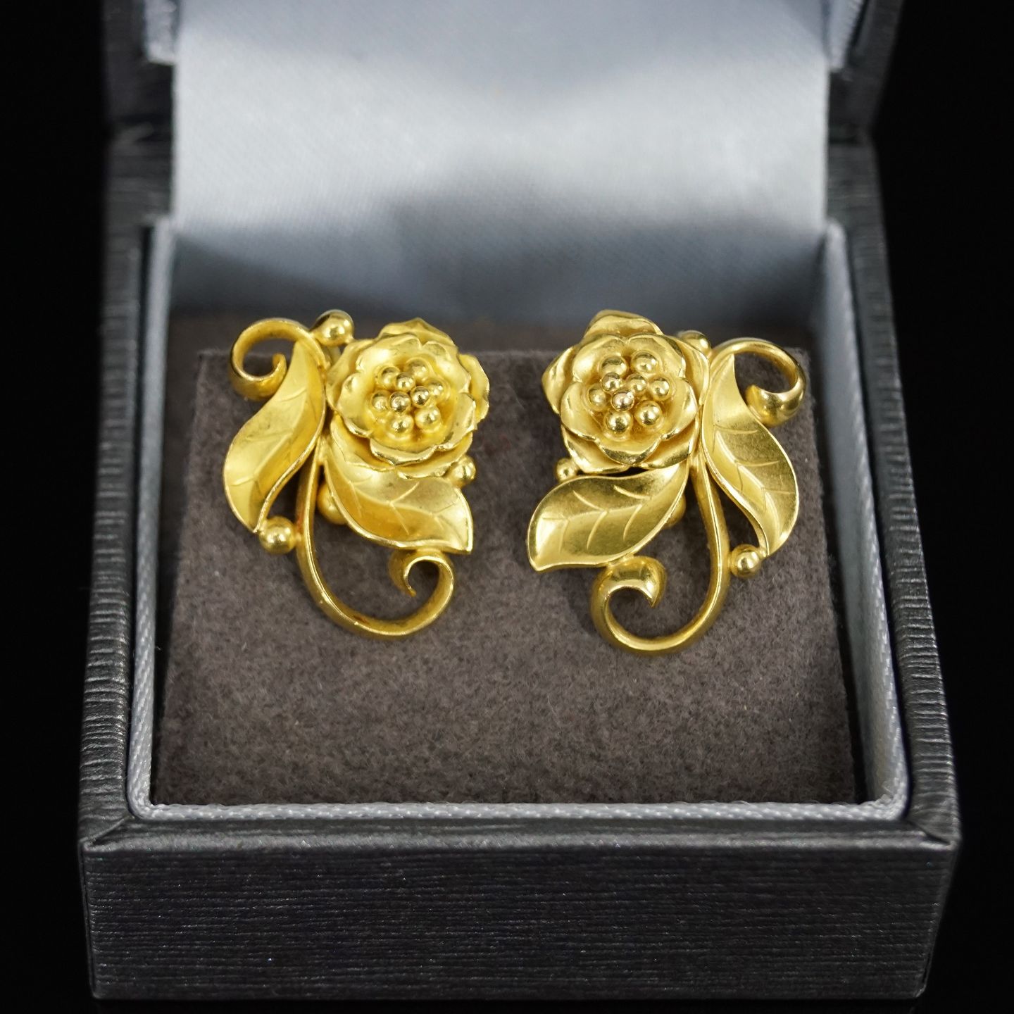 Georg Jensen; Øreringe/øreskruer af 18 kt. guld, prydet med blomster- og bladmønster. H. 2 cm. B. 1,9 cm.