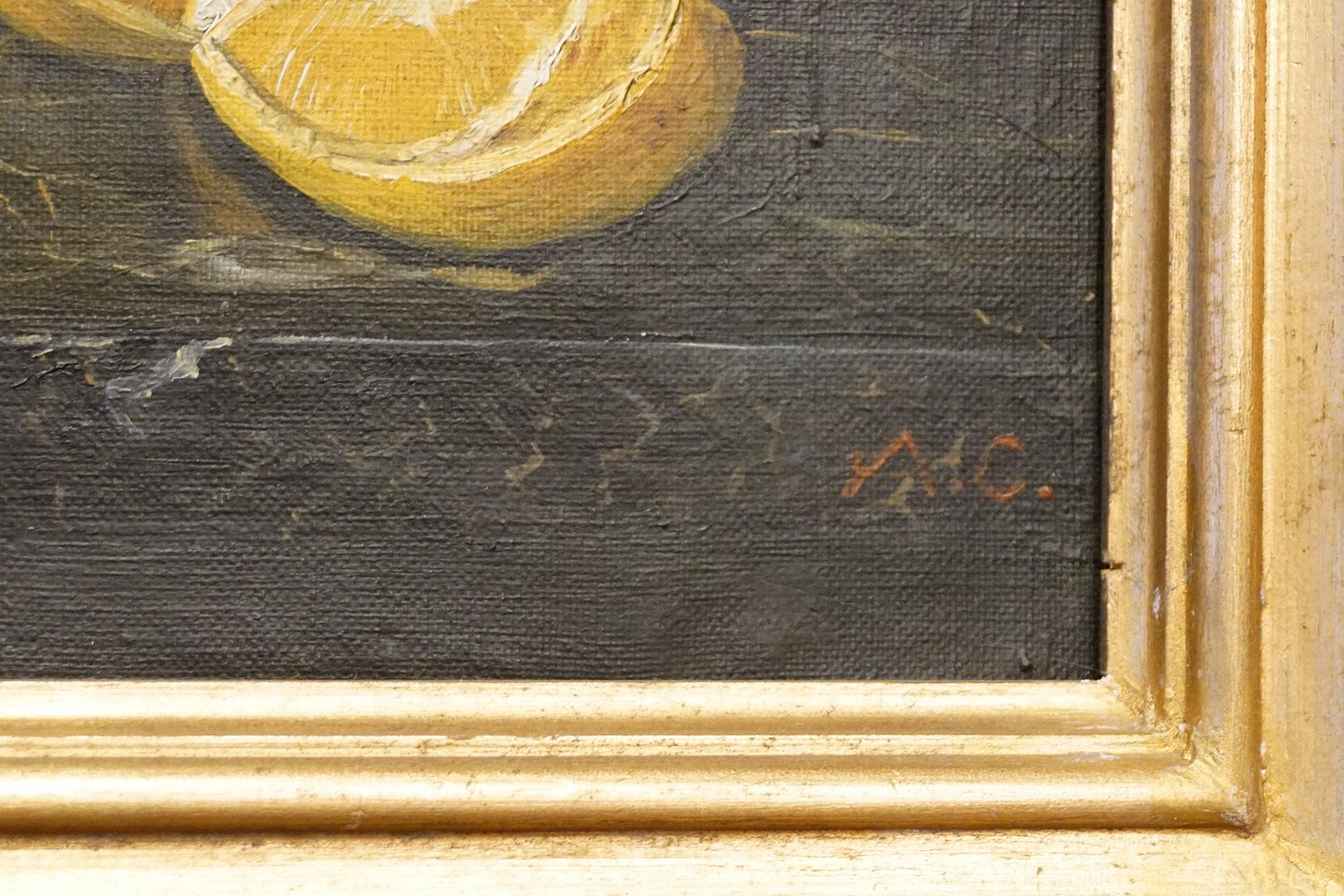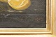 Maleri, stilleben, opstilling på bord med appelsiner og vinflaske, 1900-tallet