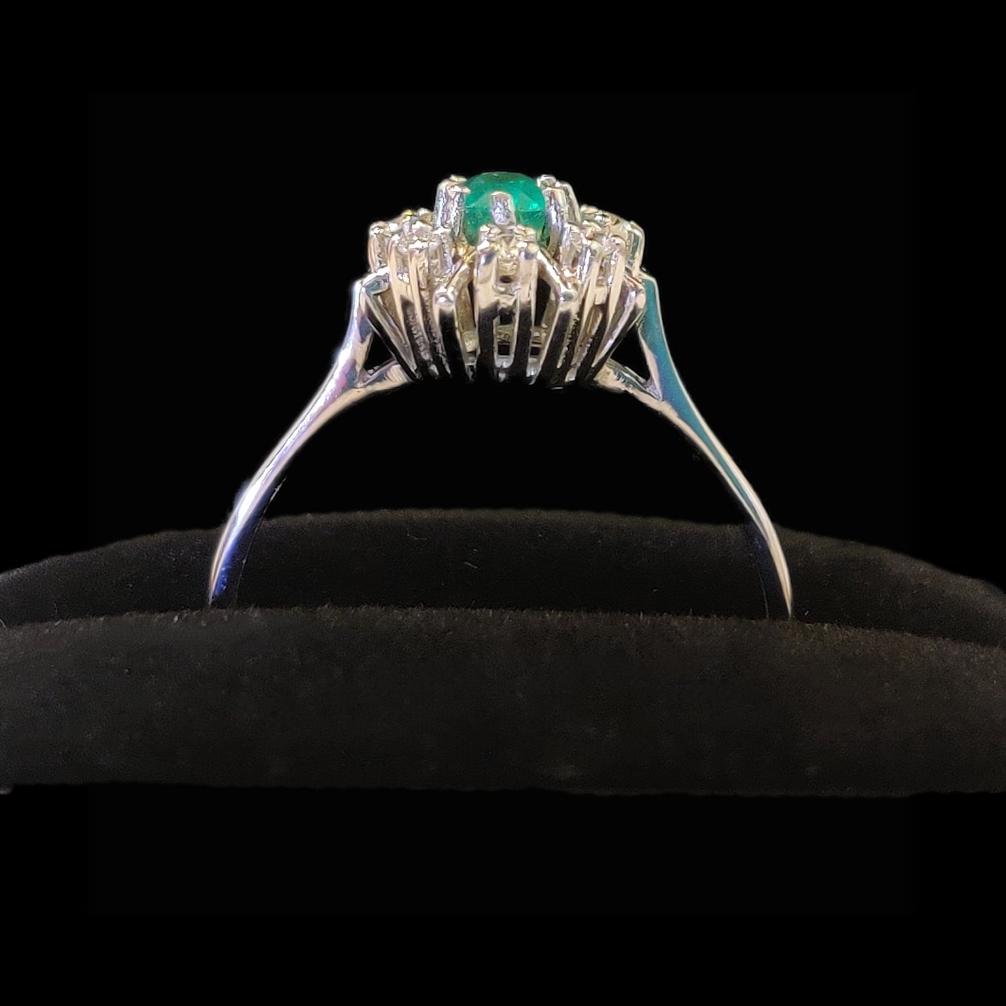 Rosetring i 14 kt. hvidguld, prydet med 1 oval slebet smaragd omkranset af 8 små brillantslebene diamanter. Brillanter i alt ca. 0,16 ct. Farve: Wesselton (H).