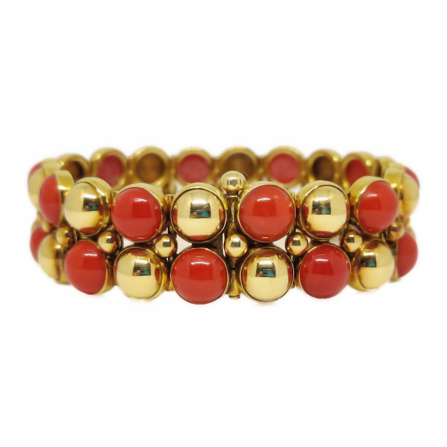 Karl Gustav Hansen for Hans Hansen; Armbånd i 14 guld med koraller #458. Runde led med skiftevis guld- og koral halvkugler.
