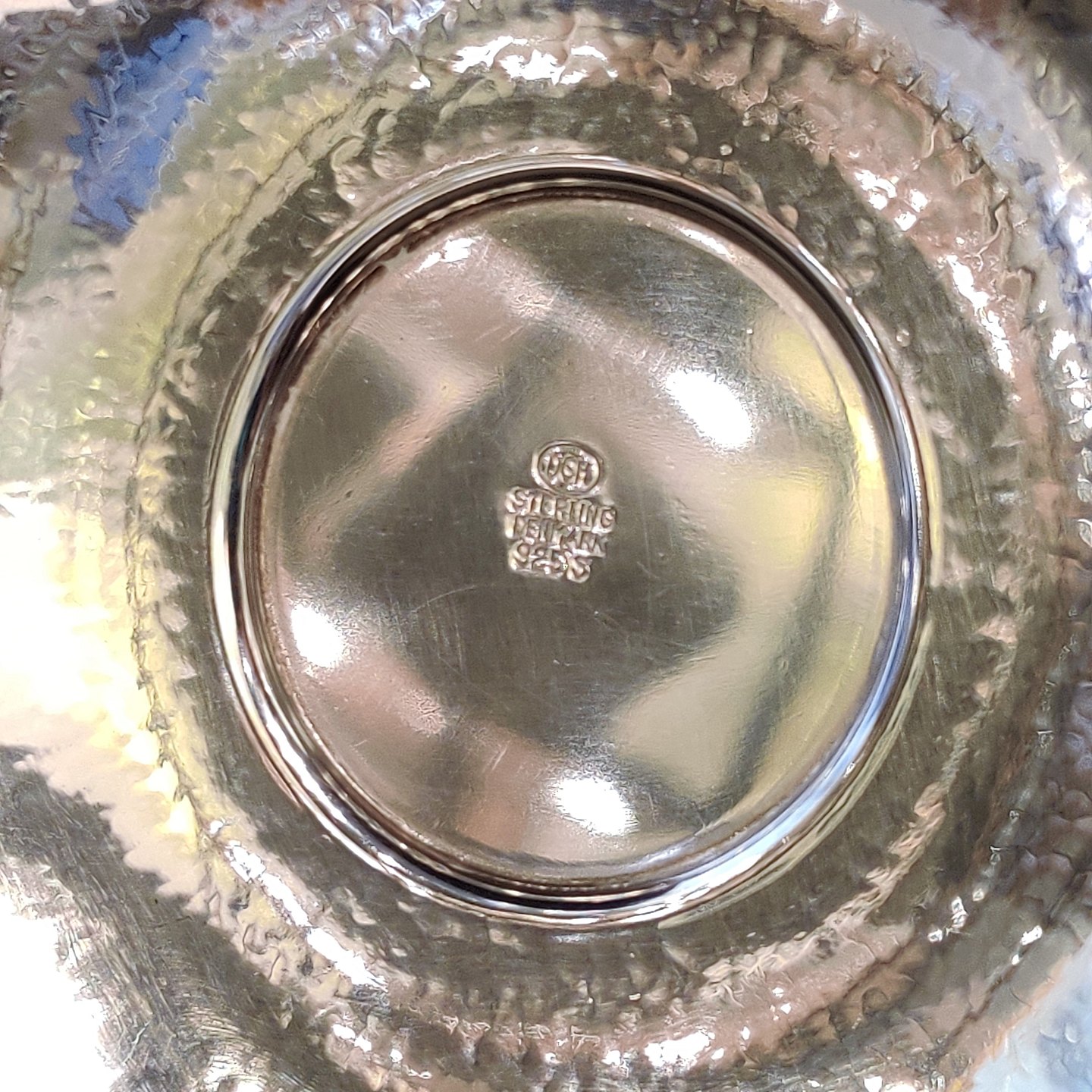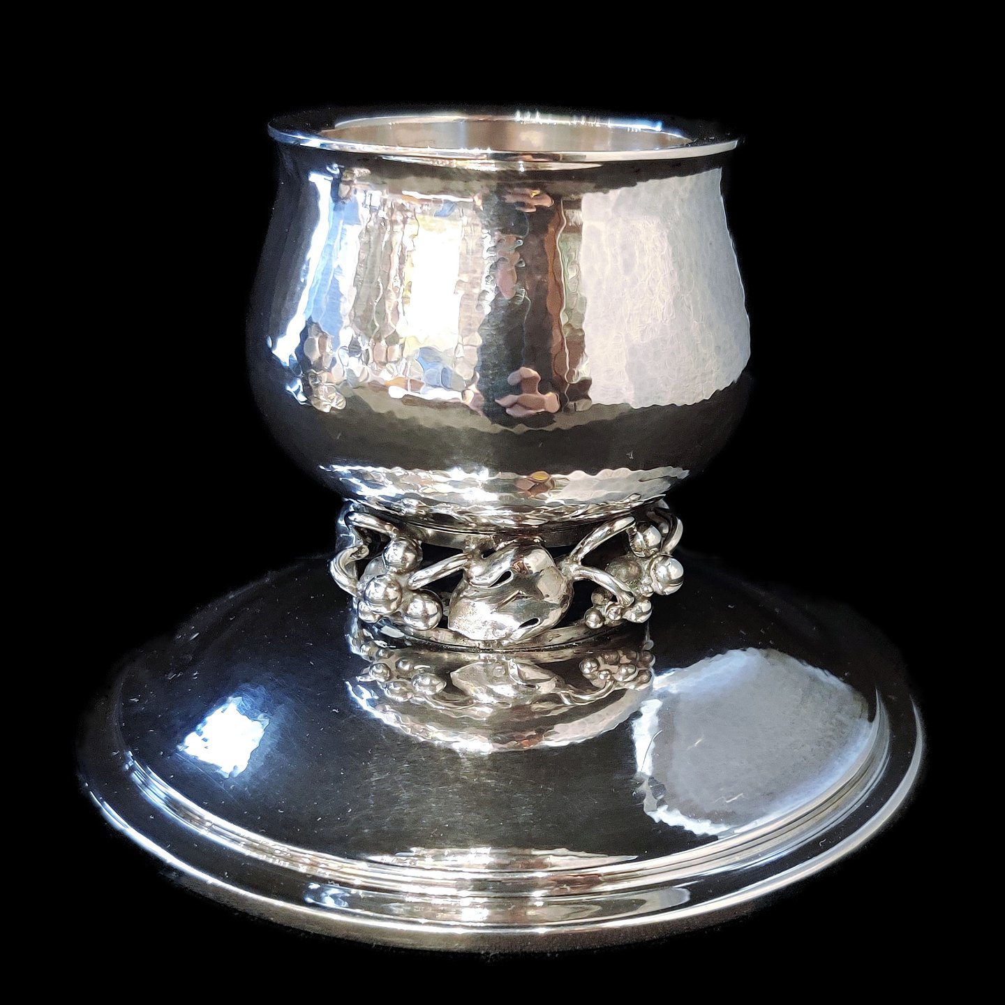 Dansk Guldsmede-Håndværk; Par lysestager af hamret sterling sølv, prydet med drueklaser og blade. Passer til bloklys diam. 4,8 cm.