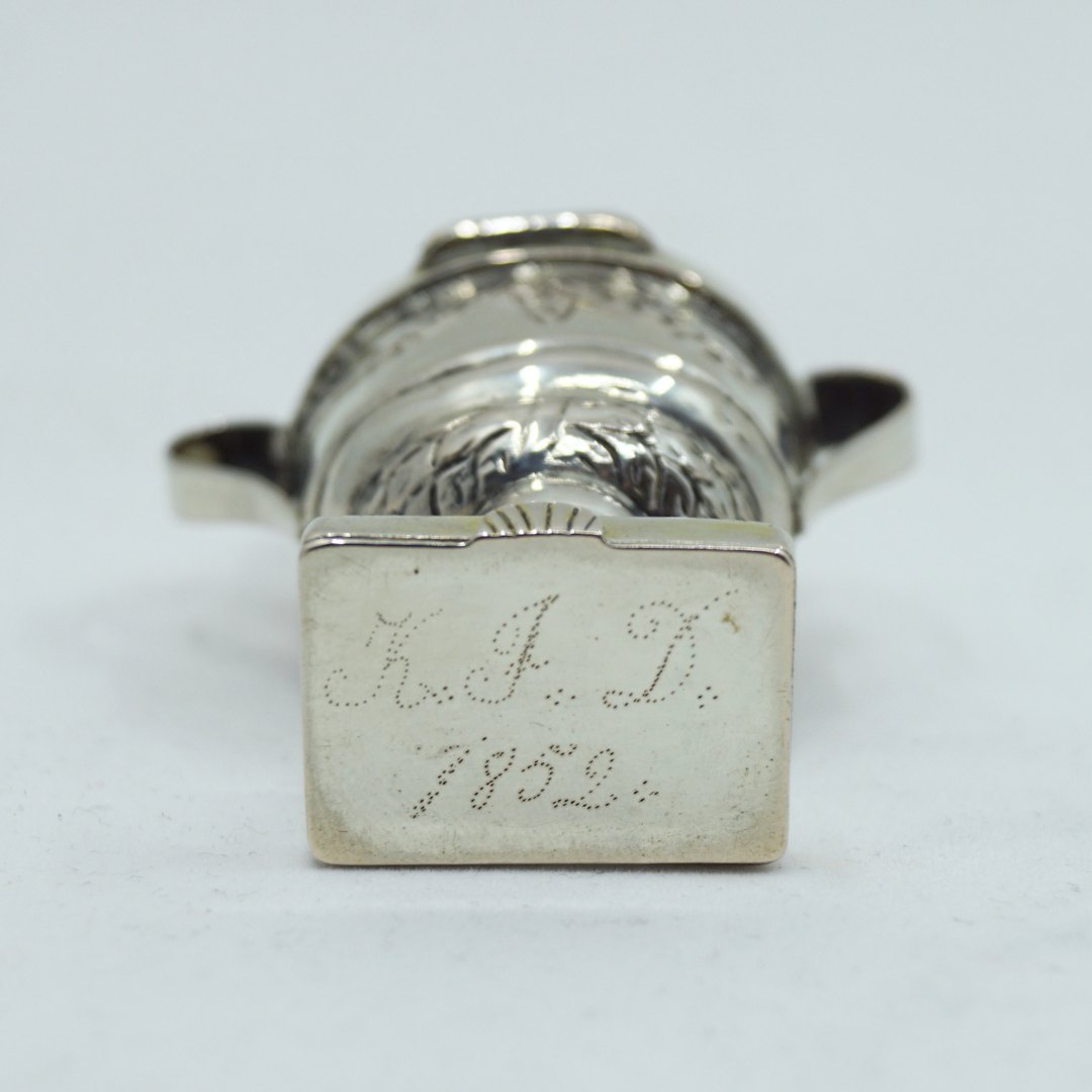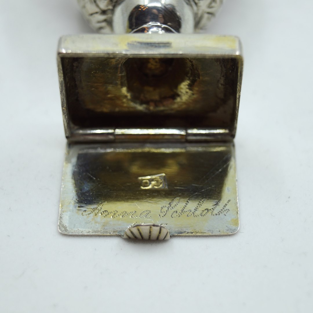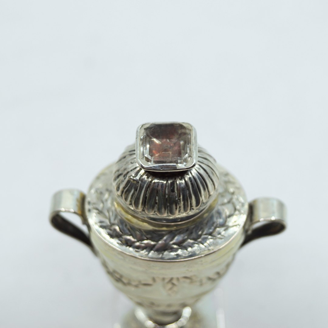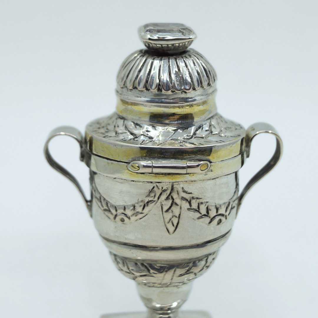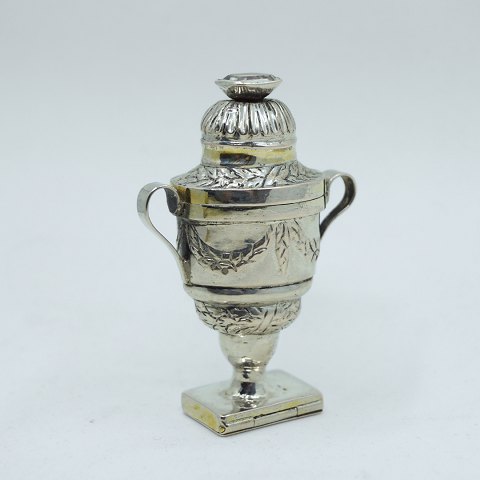 Vinaigrette in Louise Seize style, of partially gilded silver, gilded inside. Adorned with a single glas stone at the top. Square foot piece with balsam storage. Stamped "K. J. D. 1852" on the outside.