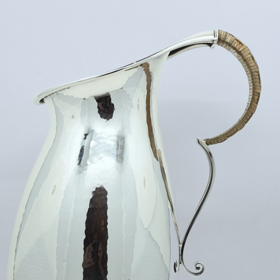 Karl Gustav Hansen for Hans Hansen Sølvsmedie. Kande af let hamret sterlingsølv, halvdelen af hanken med flet. Fra 1933.