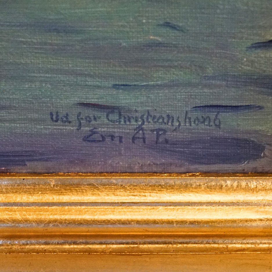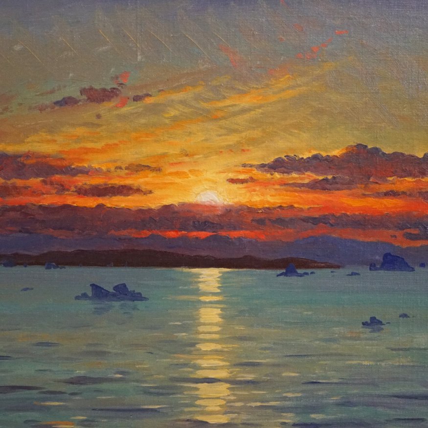 Emanuel A. Petersen grønlandsk oliemaleri med motiv af solnedgang ud for Christianshaab / Qasigiannguit.
