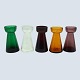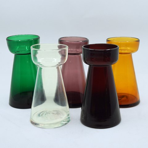 Samling på fem stk. tulipanglas fra Holmegaard ca. år 1900. Bestående af farverne; klar, ravfarvet (gul), grøn, violet (manganfarvet) og rød.
